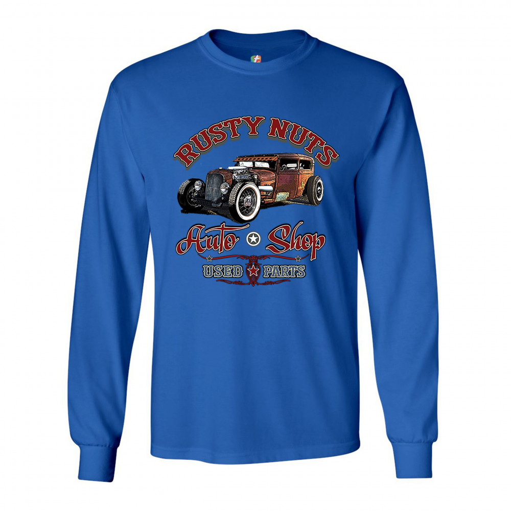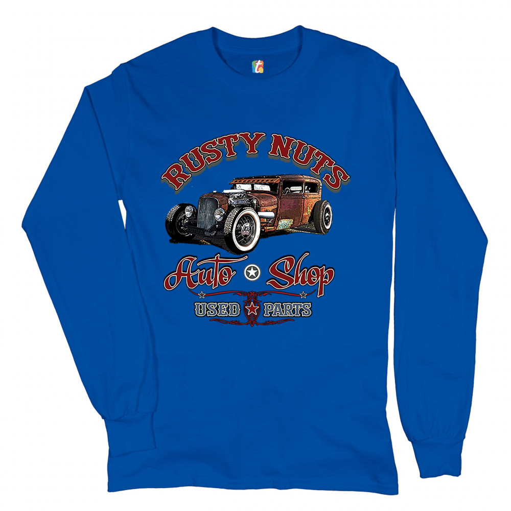 RUSTY NUTS AUTO SHOP long sleeve t-shirt hot rod rat rod vintage old school royal blue