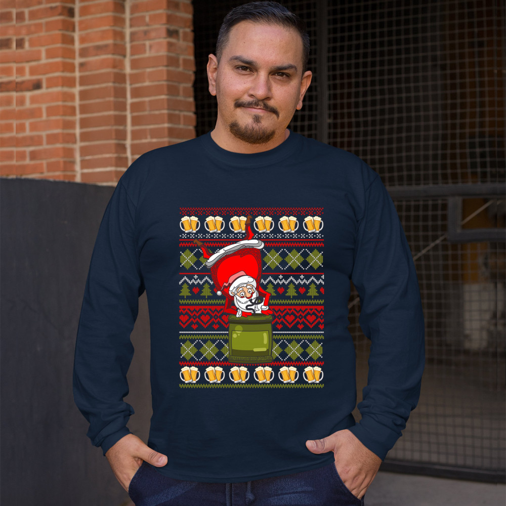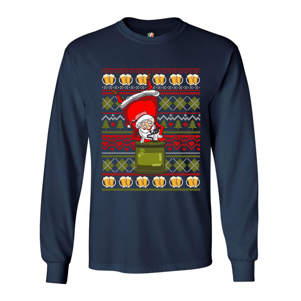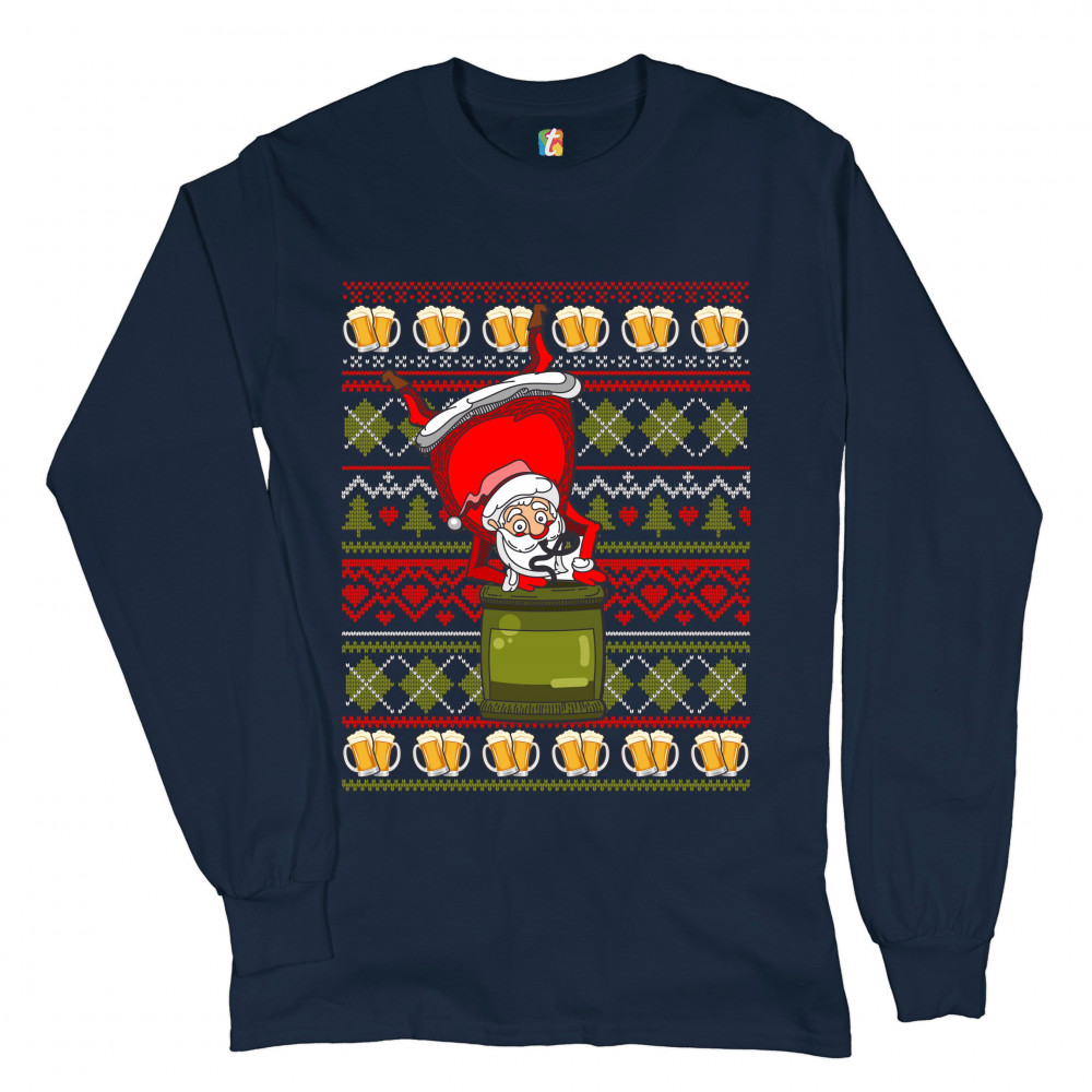 SANTA CLAUS KEG STAND long sleeve t-shirt christmas ugly sweater beer drinking navy blue