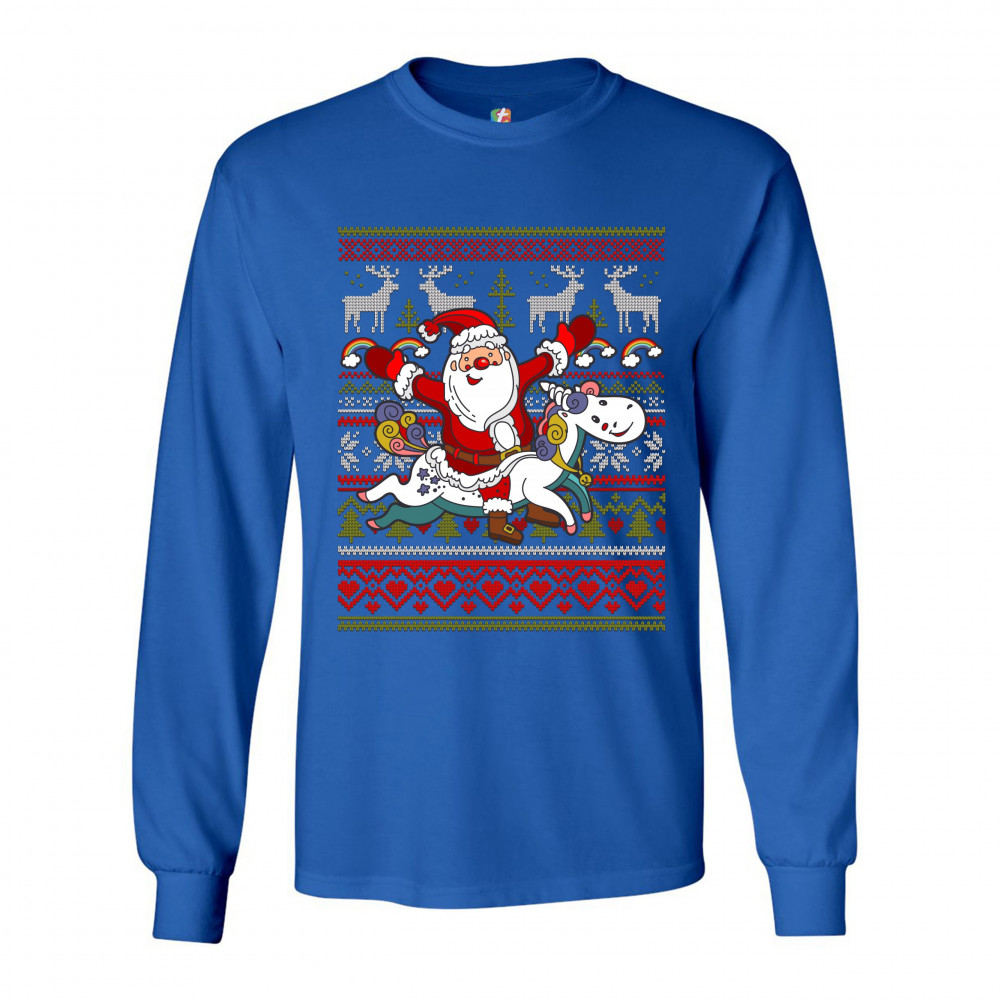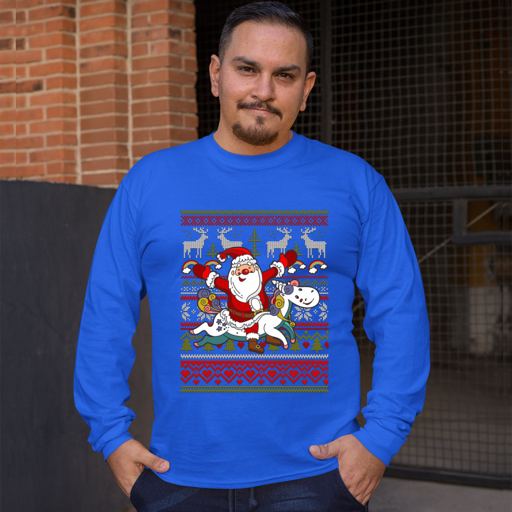 SANTA CLAUS RIDING A UNICORN long sleeve t-shirt merry christmas ugly sweater royal blue