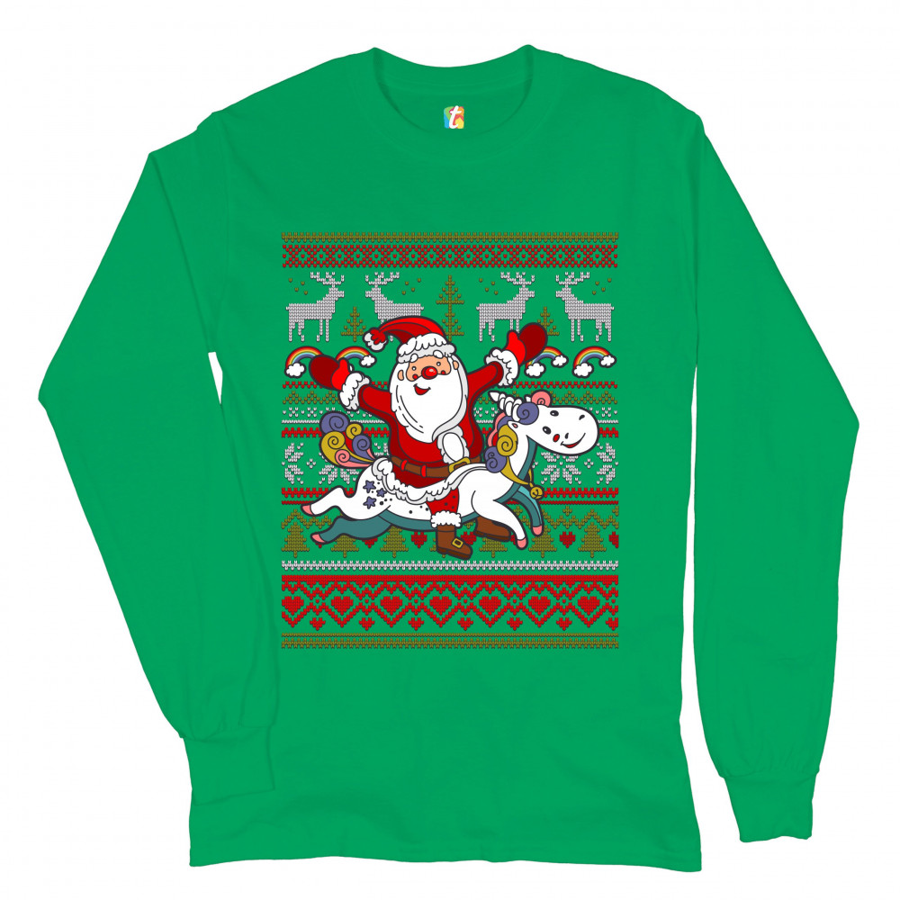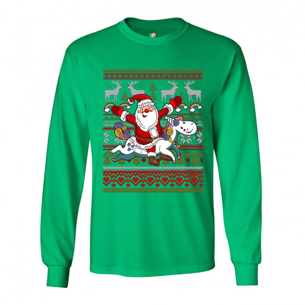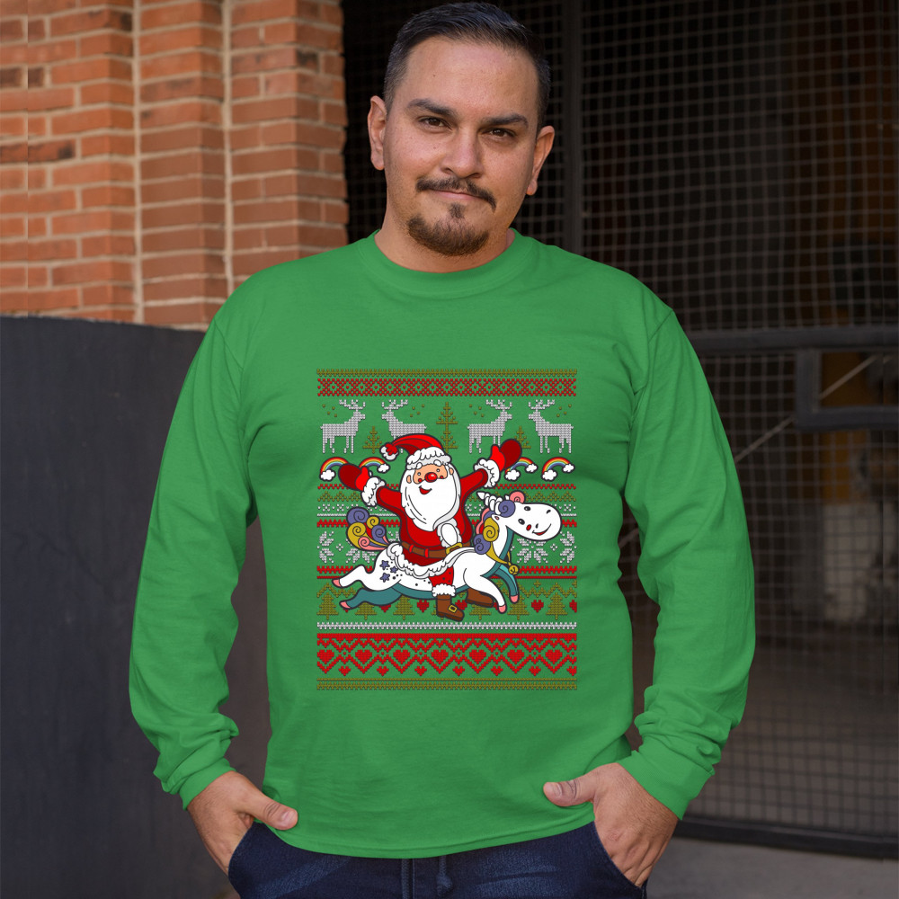 SANTA CLAUS RIDING A UNICORN long sleeve t-shirt merry christmas ugly sweater green