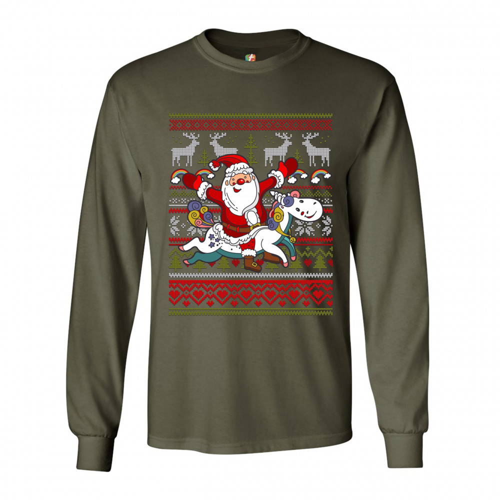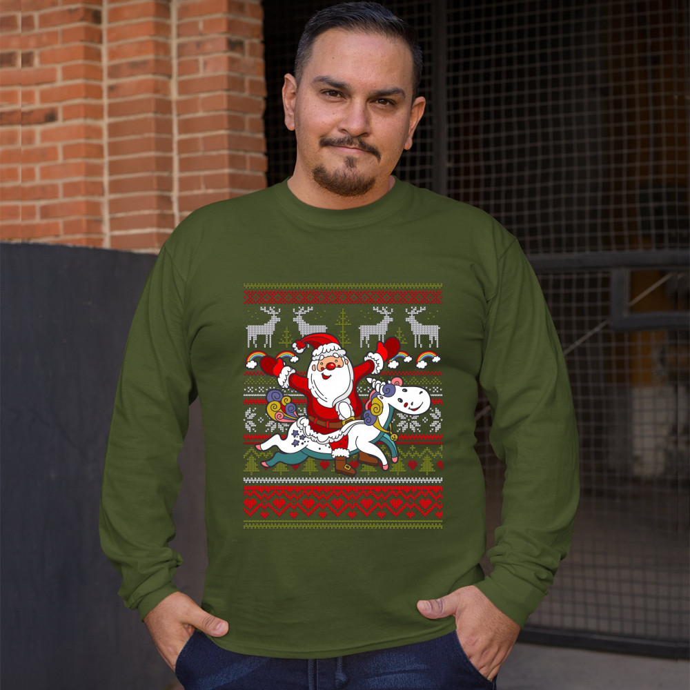 SANTA CLAUS RIDING A UNICORN long sleeve t-shirt merry christmas ugly sweater military green