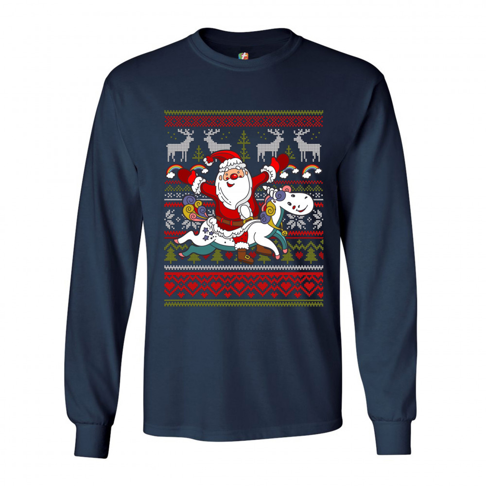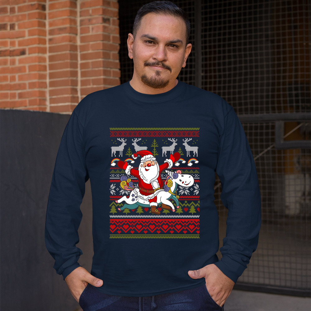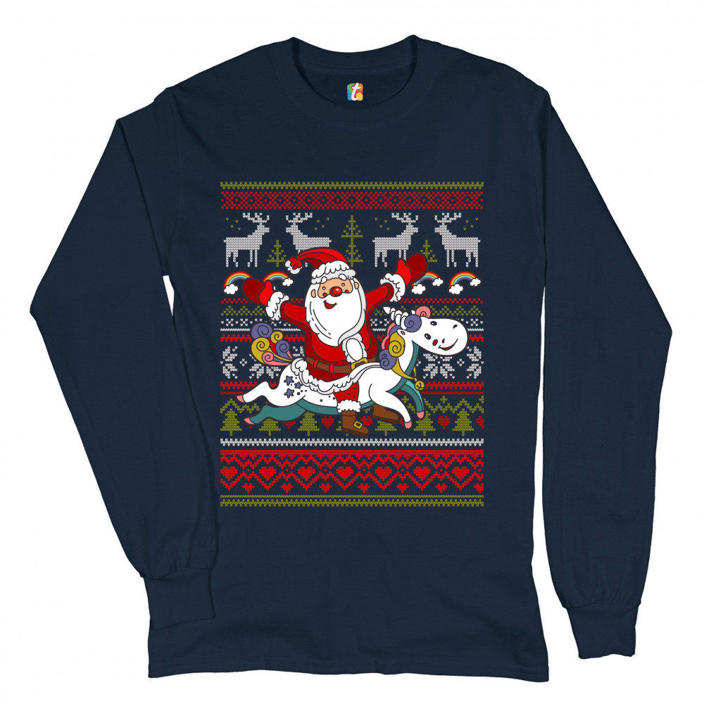 SANTA CLAUS RIDING A UNICORN long sleeve t-shirt merry christmas ugly sweater navy blue