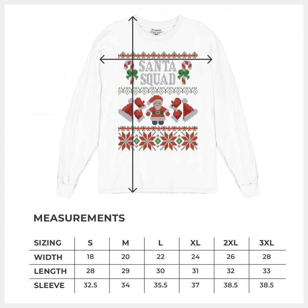 A cute print saying: "Santa Squad" and featuring 2 candy canes, 2 Christmas hats and 4 gloves. The print is decorated as an ugly sweater. Amazing choice to make people smile and spread positive vibes on Christmas Eve.