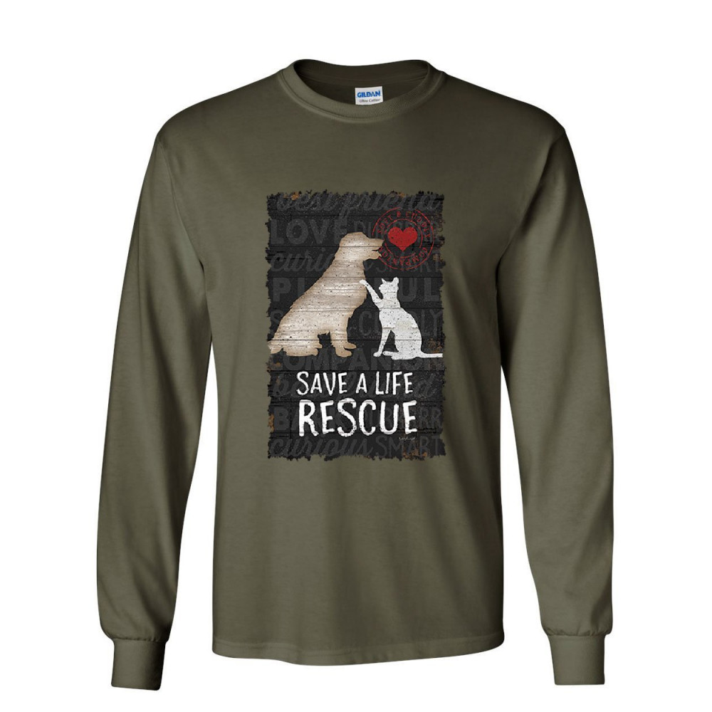 SAVE A LIFE rescue a pet long sleeve t-shirt dog cat kitty puppy shelter paw tee military green