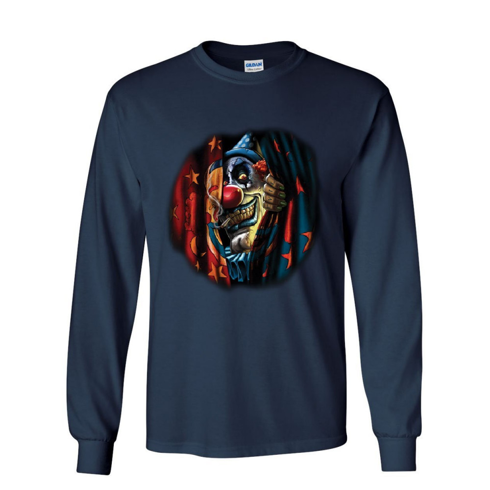 SCARY CIRCUS CLOWN long sleeve t-shirt insane creepy clown evil mad horror tee navy blue