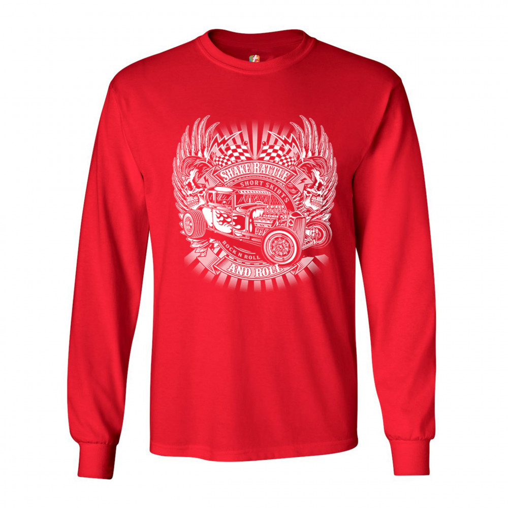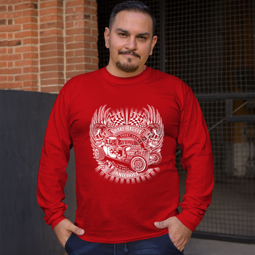 A print featuring a vintage hot rod with an exposed engine, a pair of skulls, wings and racing flags. On several stripes it says: "Shake rattle and roll", "short skirts" and "rock and roll". A great choice for a fan of customized American classic cars and