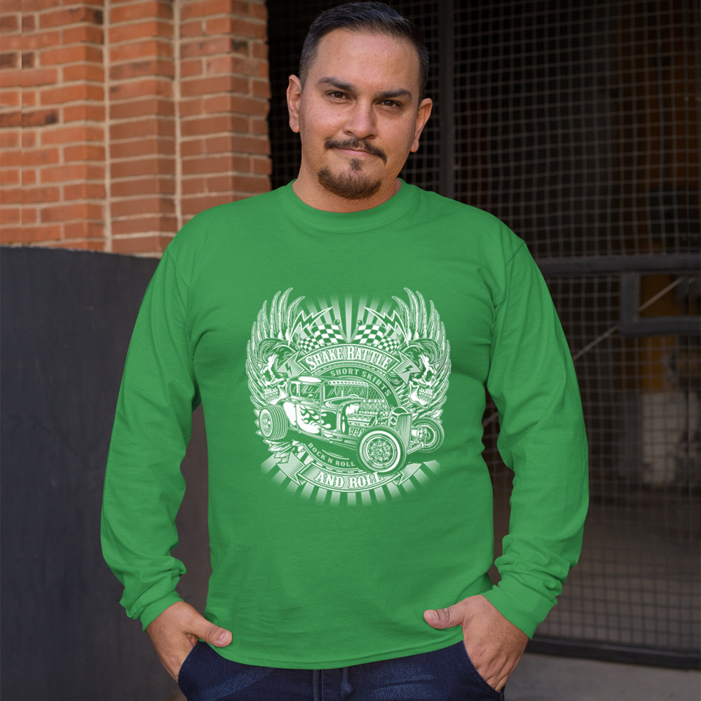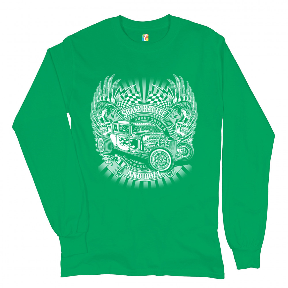 A print featuring a vintage hot rod with an exposed engine, a pair of skulls, wings and racing flags. On several stripes it says: "Shake rattle and roll", "short skirts" and "rock and roll". A great choice for a fan of customized American classic cars and