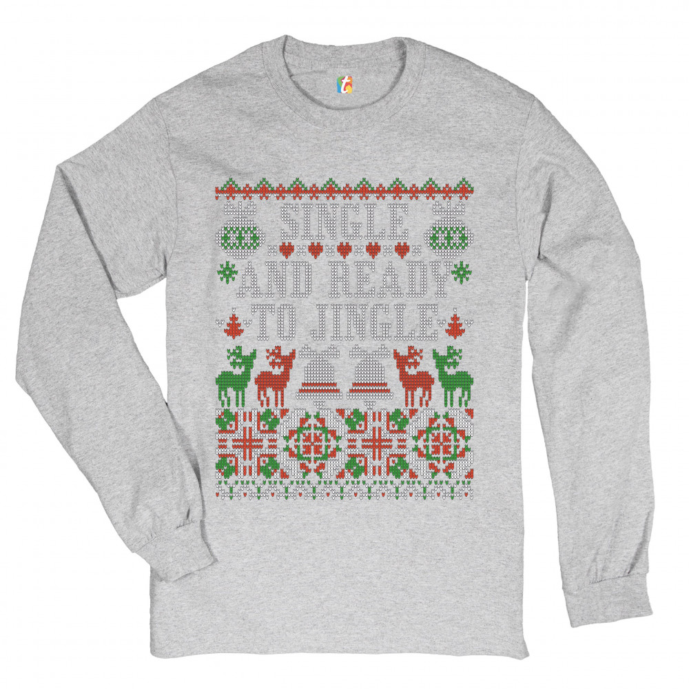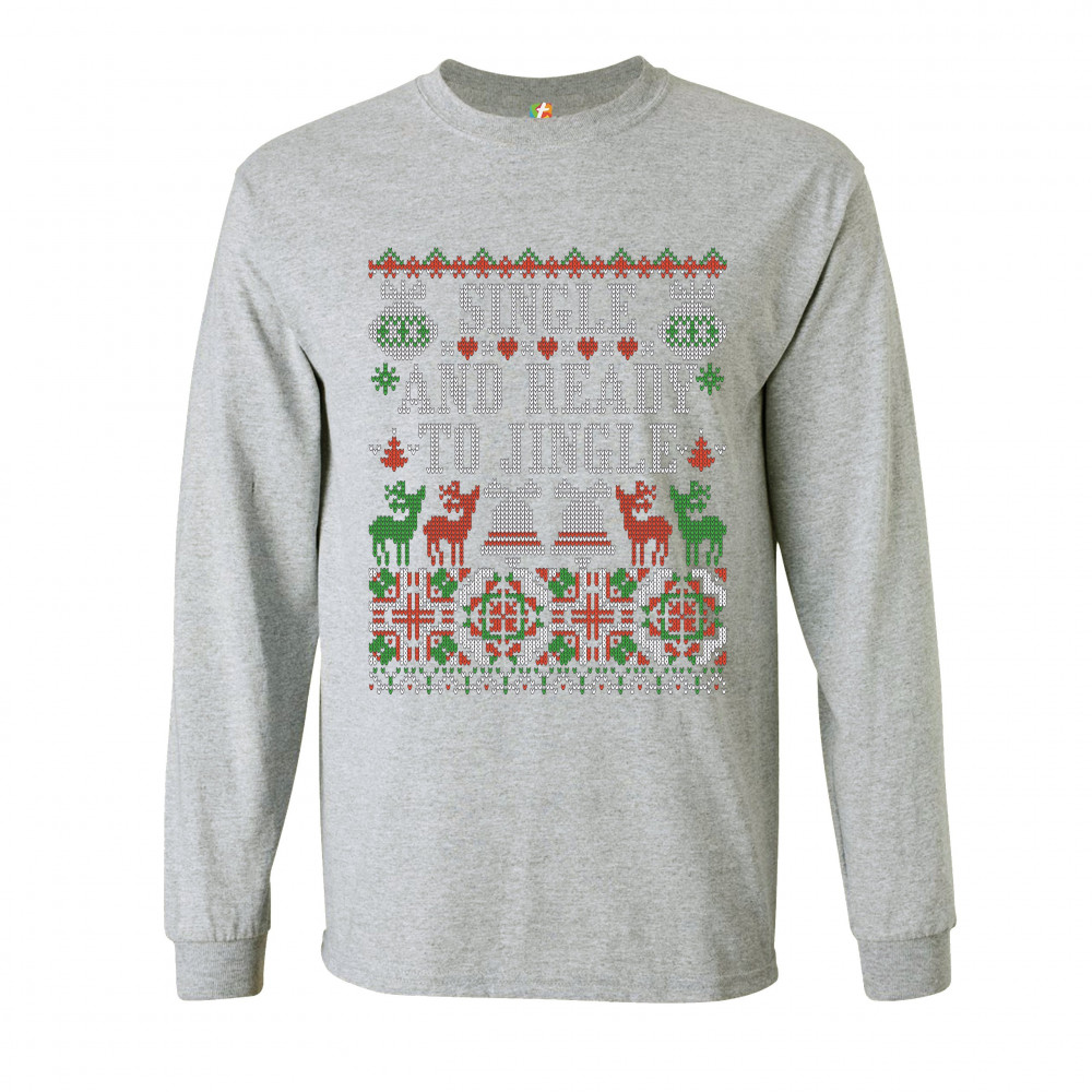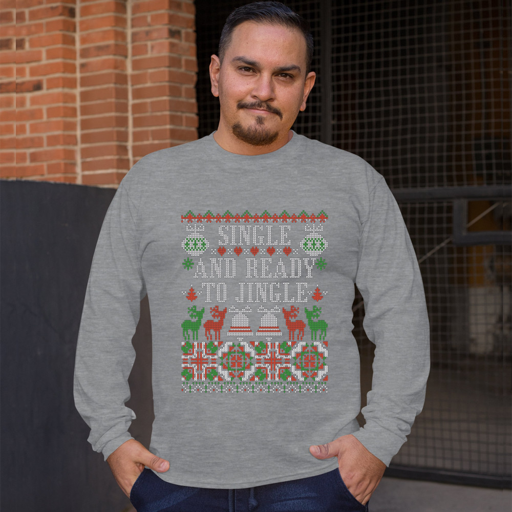 A print saying: "Single and Ready to Jingle" and featuring four reindeers and two Christmas bells. The print is designed as an ugly sweater. Amazing choice for a single person who wants to make people smile and spread positive vibes on Christmas Eve.