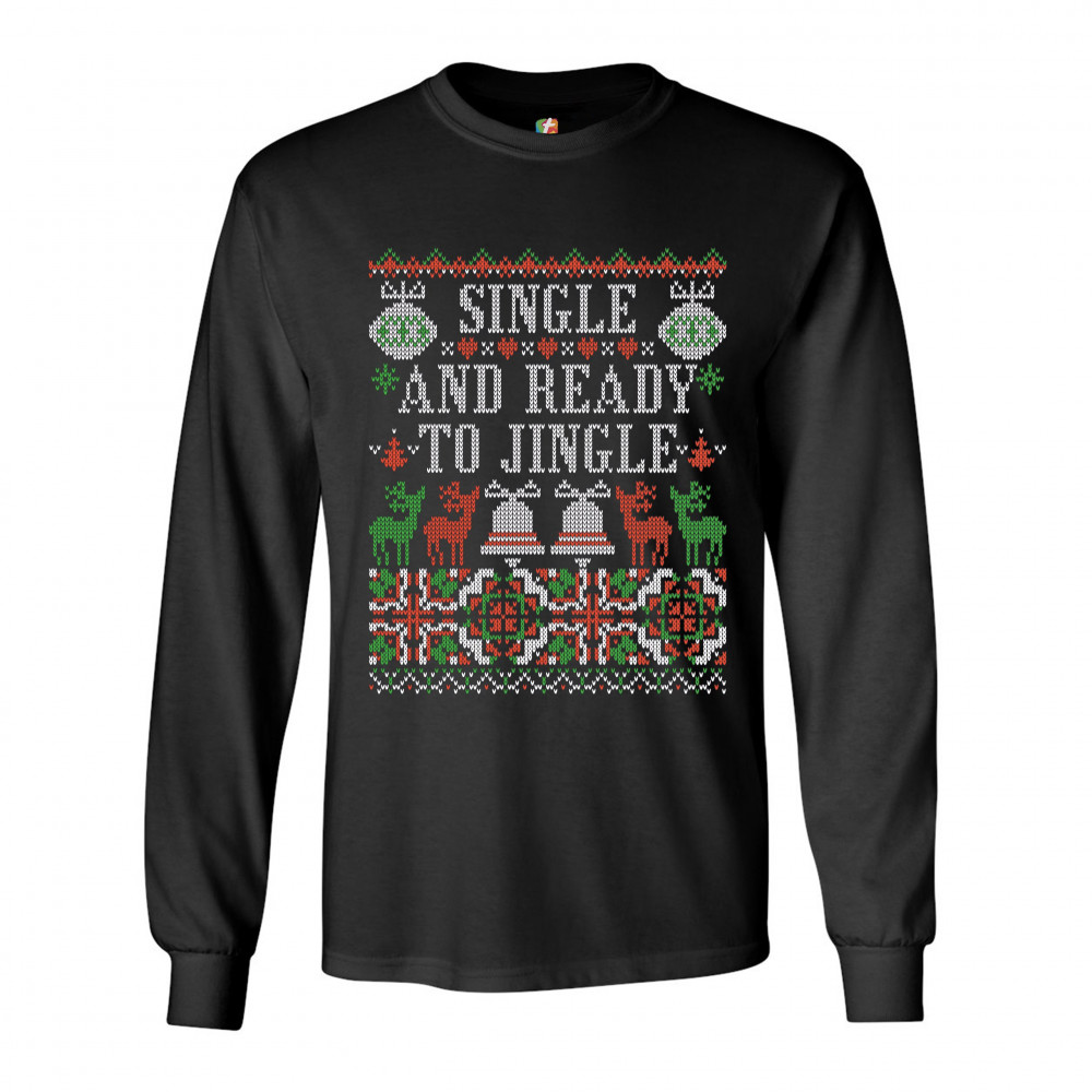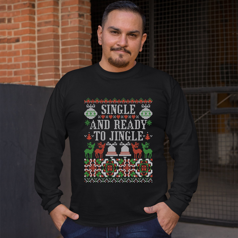 A print saying: "Single and Ready to Jingle" and featuring four reindeers and two Christmas bells. The print is designed as an ugly sweater. Amazing choice for a single person who wants to make people smile and spread positive vibes on Christmas Eve.