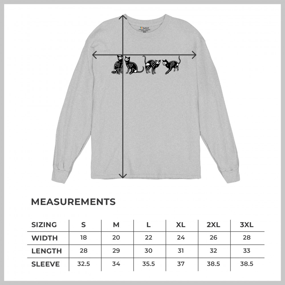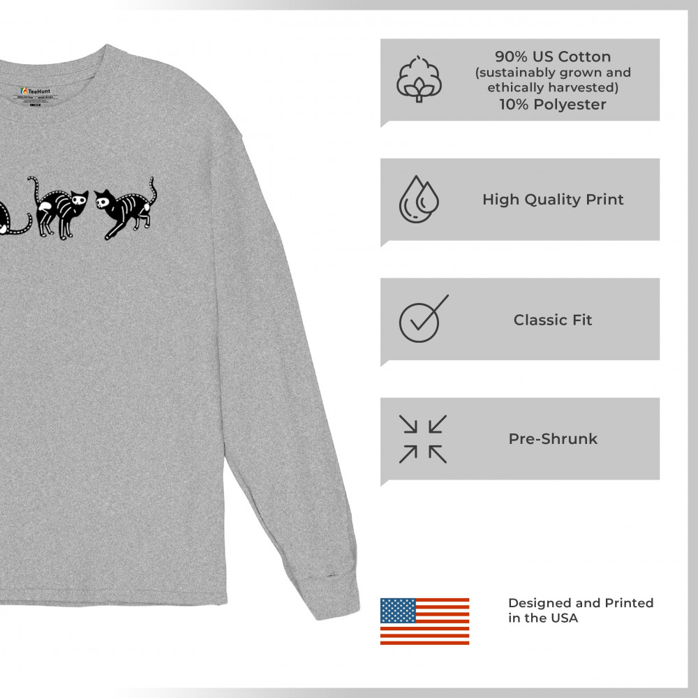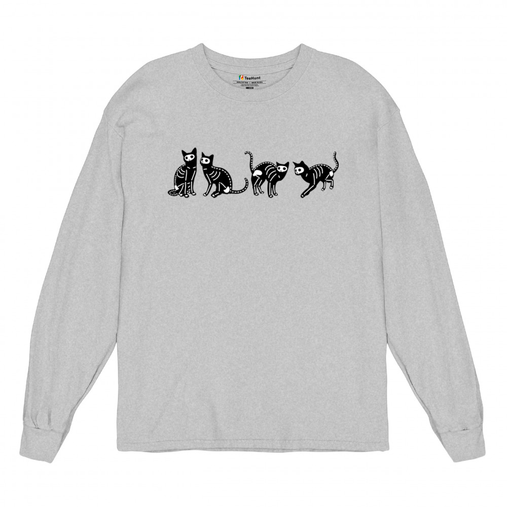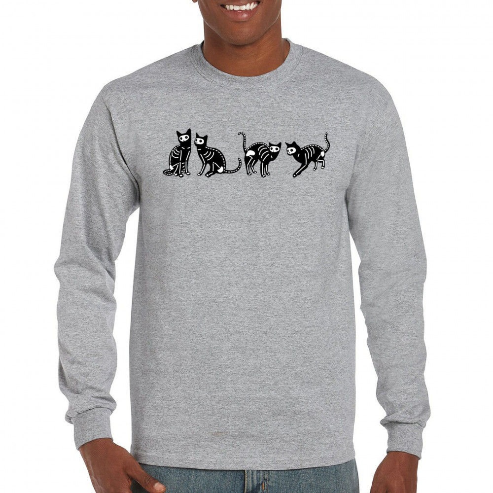 SKELETON CATS long sleeve t-shirt spooky halloween trick or treat candy bag gray