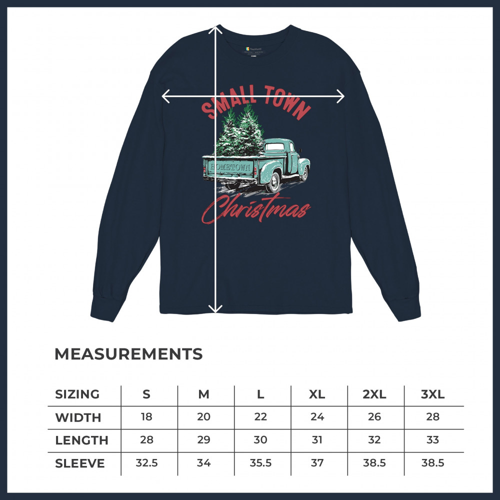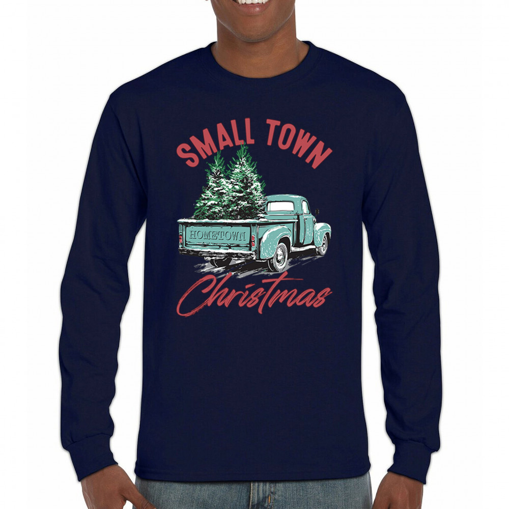 Embrace holiday nostalgia with this "Small Town Christmas" design featuring a vintage truck and Christmas trees. Perfect for rustic decor lovers.