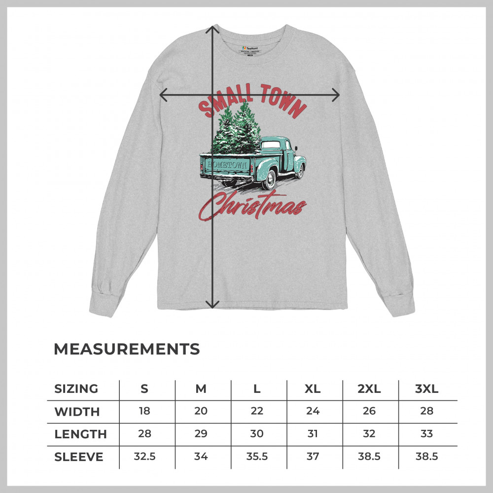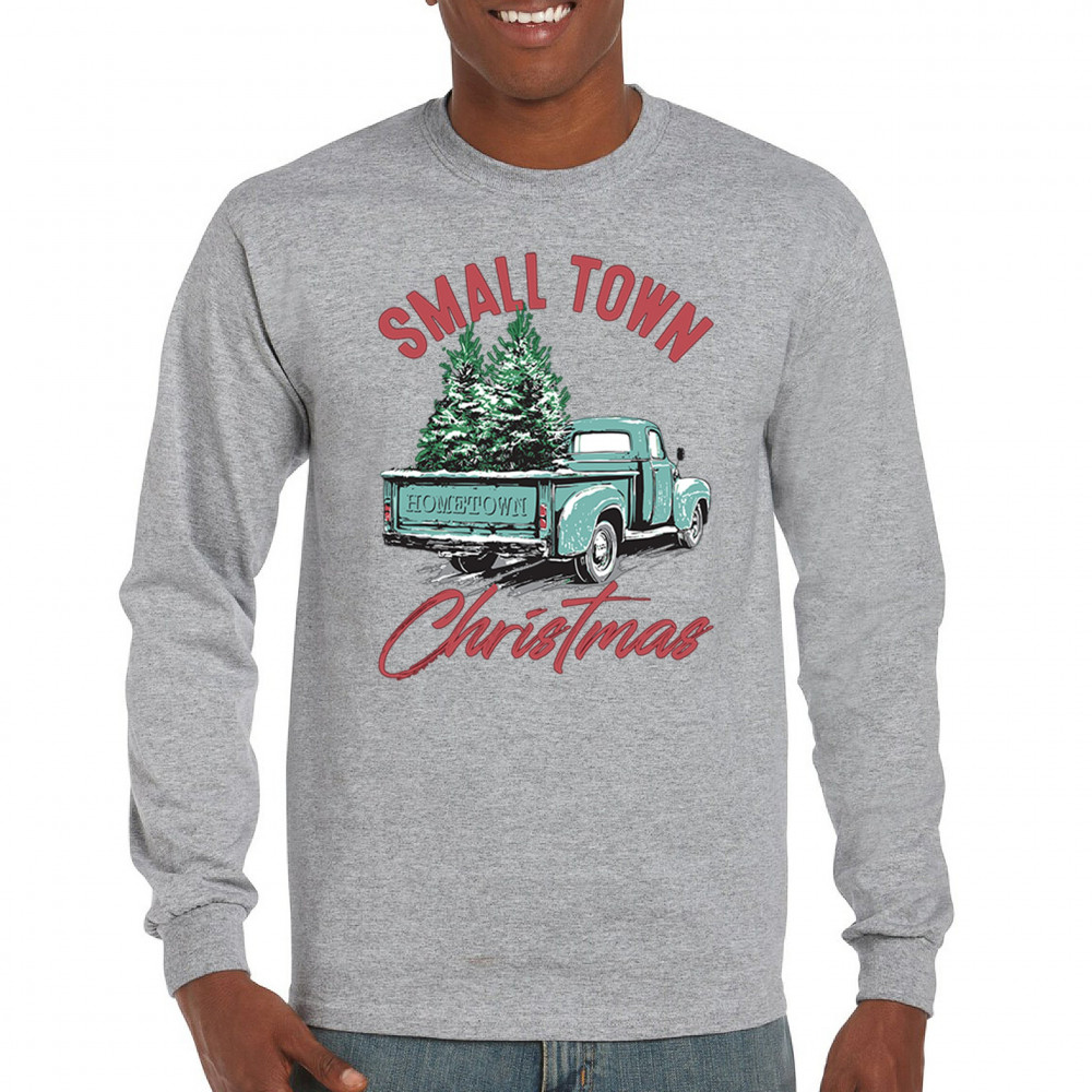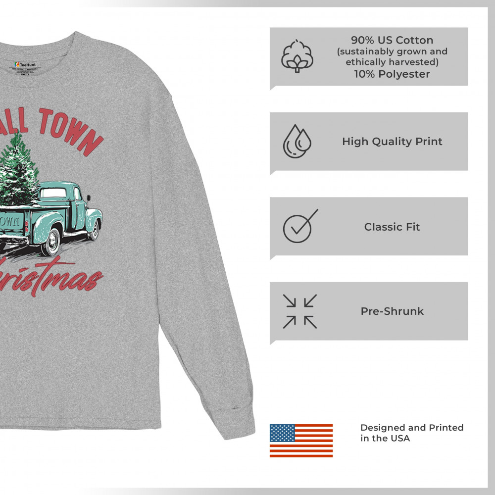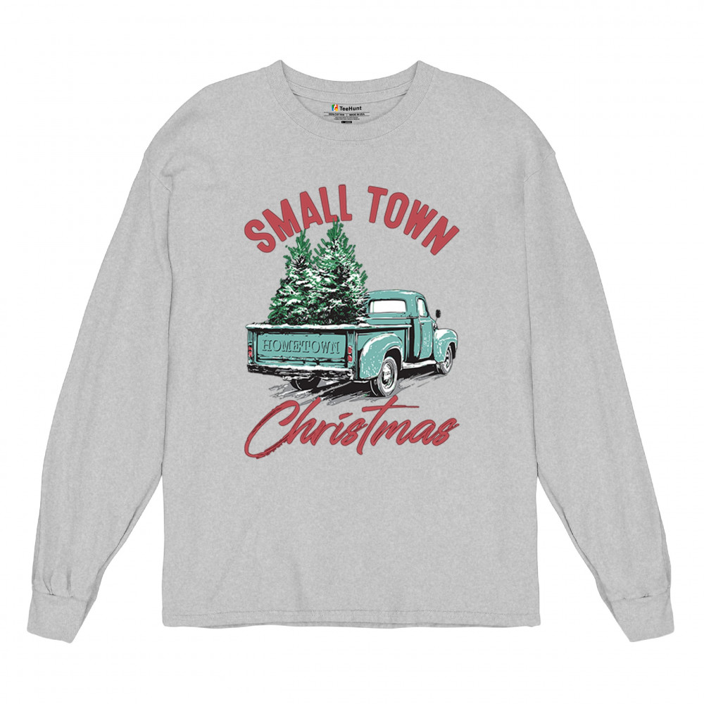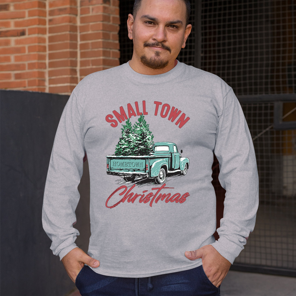 Embrace holiday nostalgia with this "Small Town Christmas" design featuring a vintage truck and Christmas trees. Perfect for rustic decor lovers.