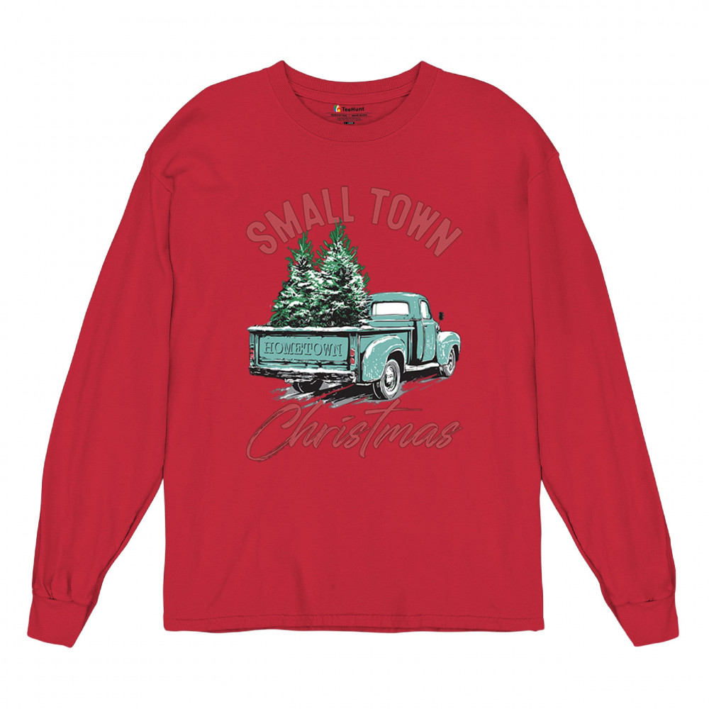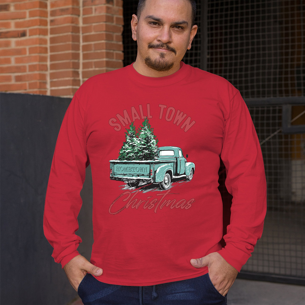 Embrace holiday nostalgia with this "Small Town Christmas" design featuring a vintage truck and Christmas trees. Perfect for rustic decor lovers.
