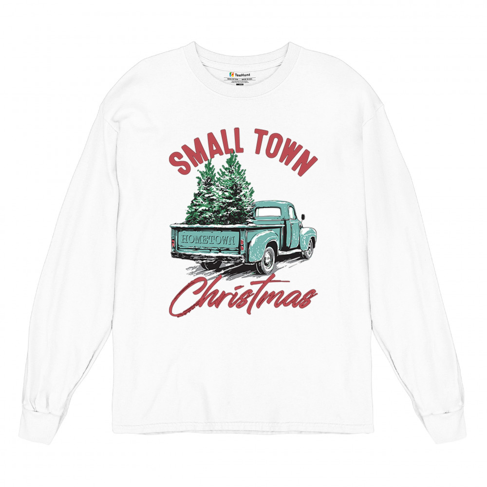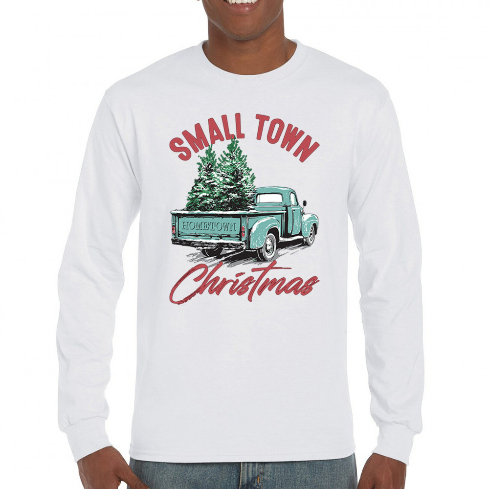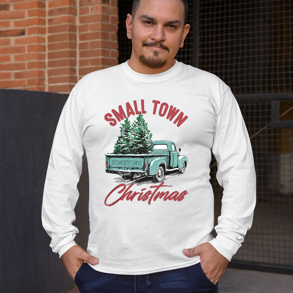 Embrace holiday nostalgia with this "Small Town Christmas" design featuring a vintage truck and Christmas trees. Perfect for rustic decor lovers.
