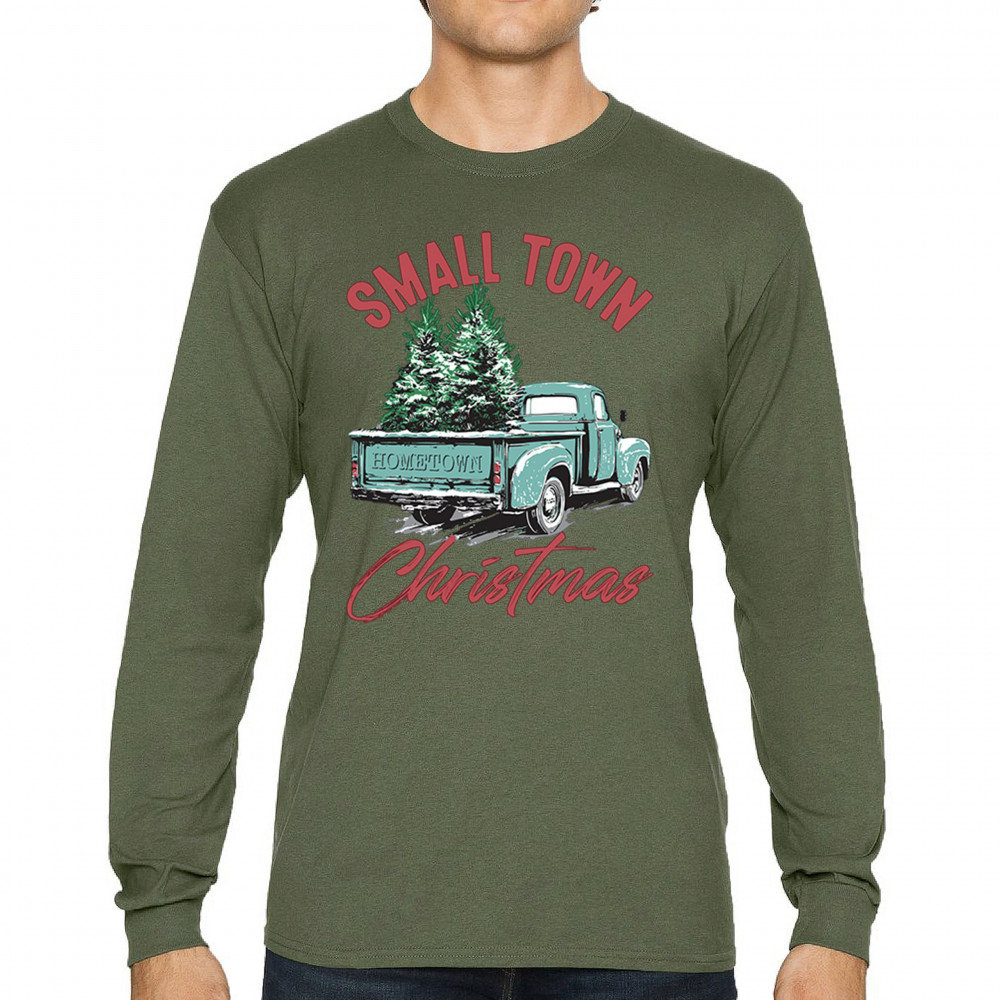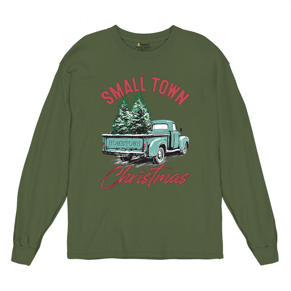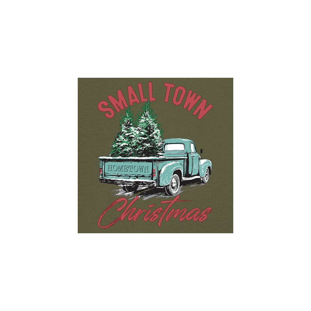 Embrace holiday nostalgia with this "Small Town Christmas" design featuring a vintage truck and Christmas trees. Perfect for rustic decor lovers.
