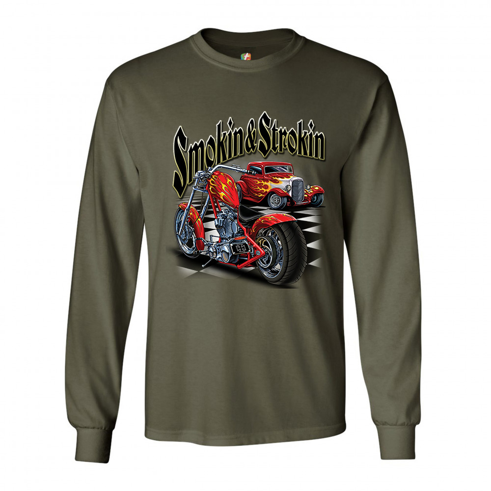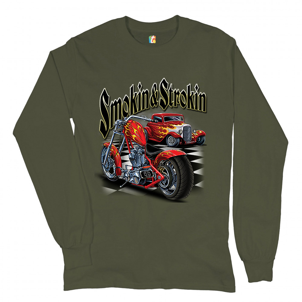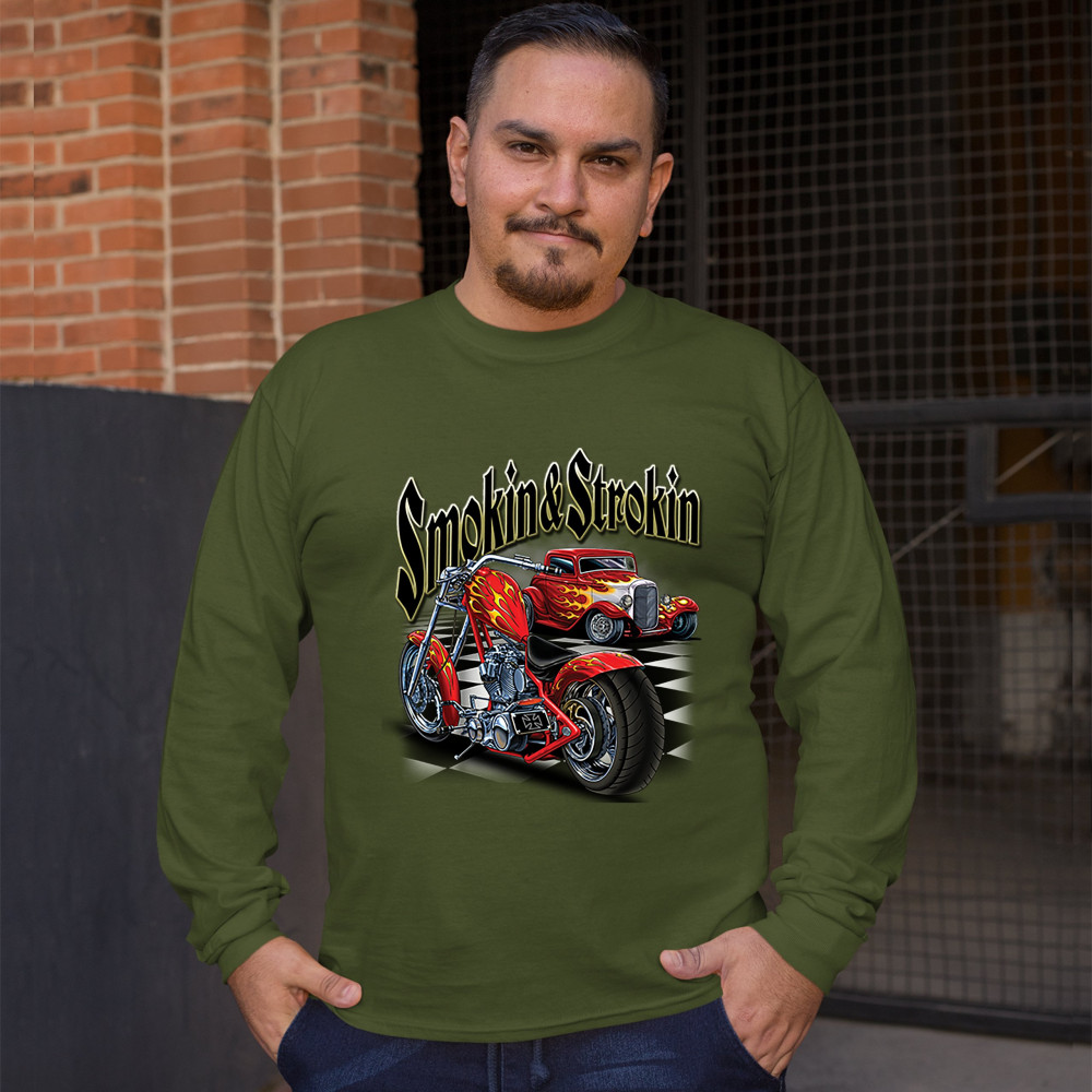 SMOKIN & STROKIN long sleeve t-shirt chopper biker hot rod live to ride military green