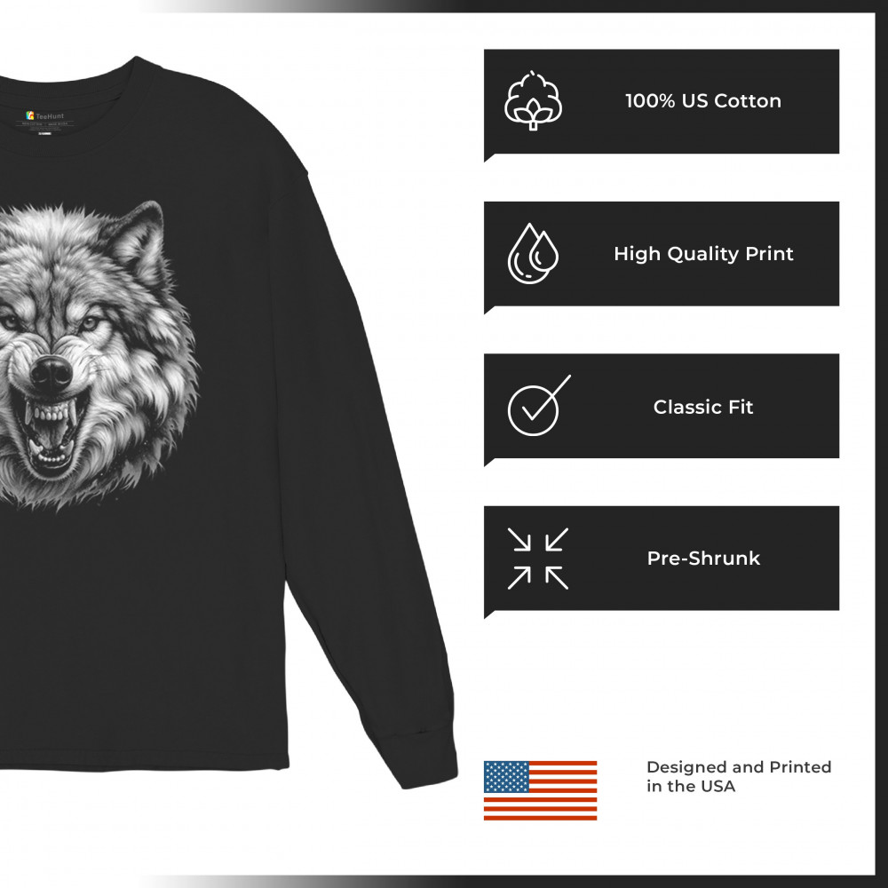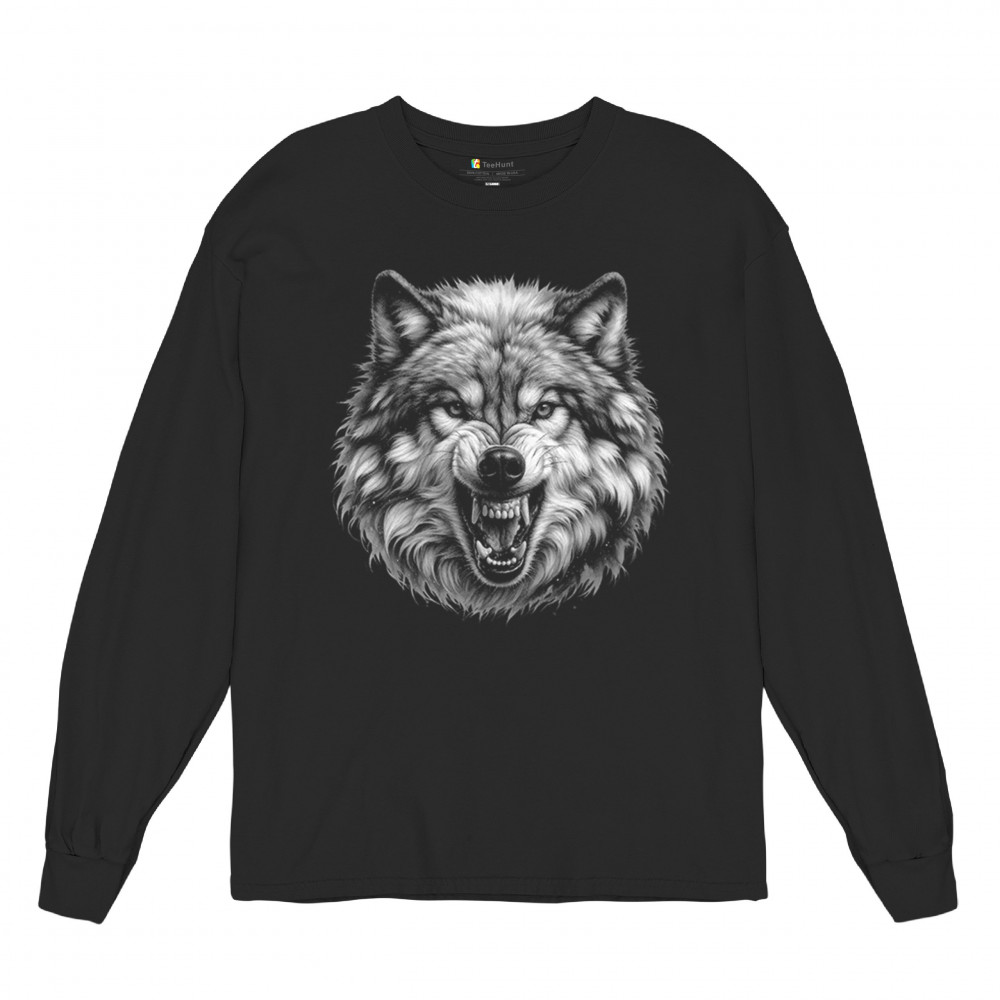 SNARLING WOLF PORTRAIT long sleeve t-shirt fierce monochrome wild animal nature black