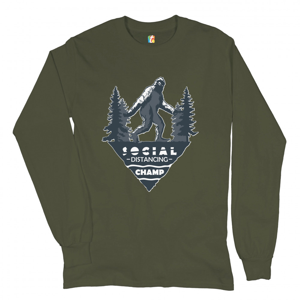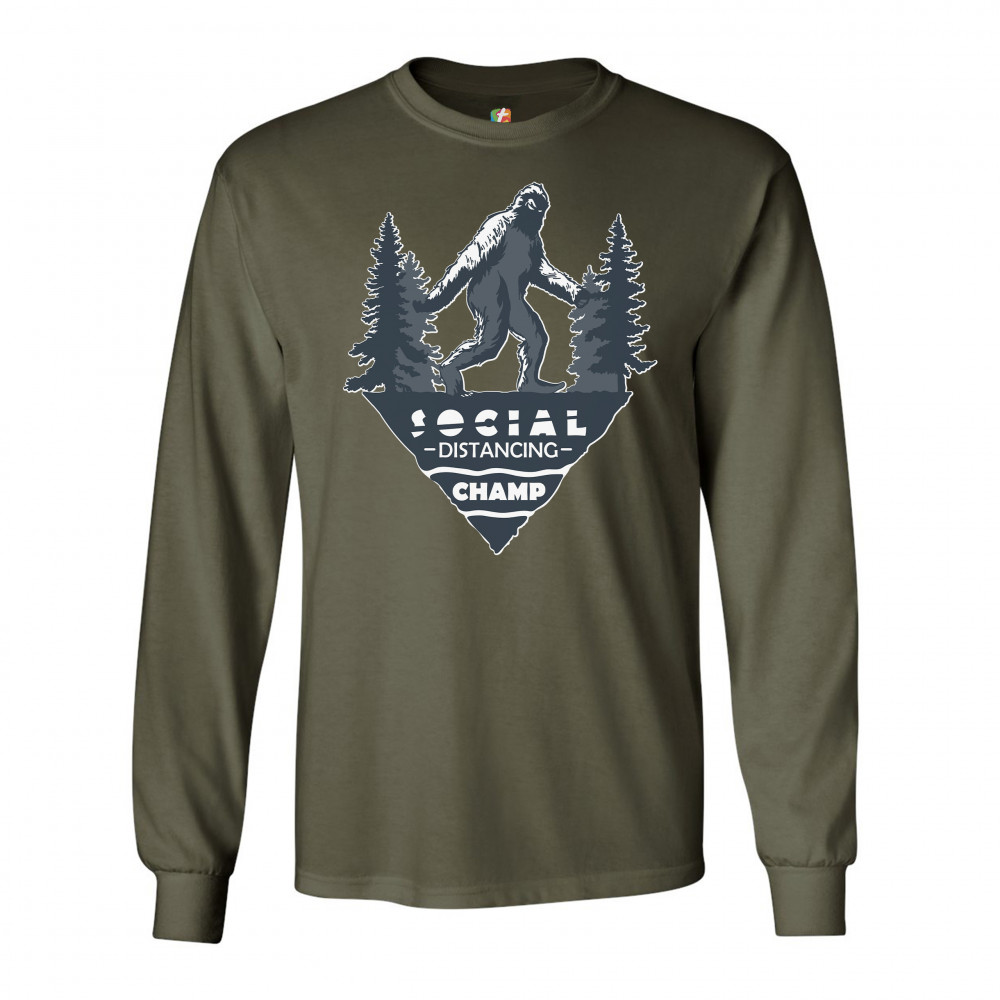SOCIAL DISTANCING CHAMP long sleeve t-shirt funny bigfoot yeti virus quarantine military green
