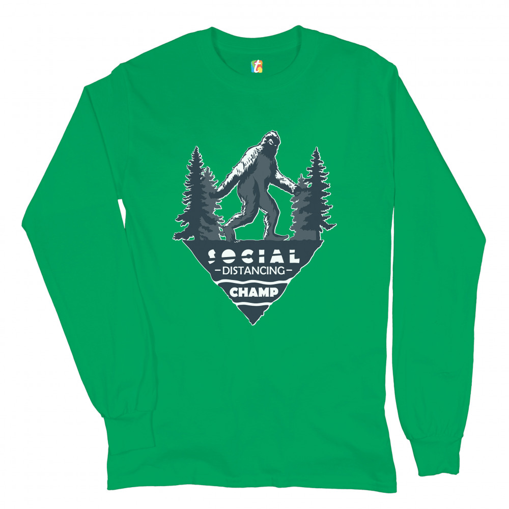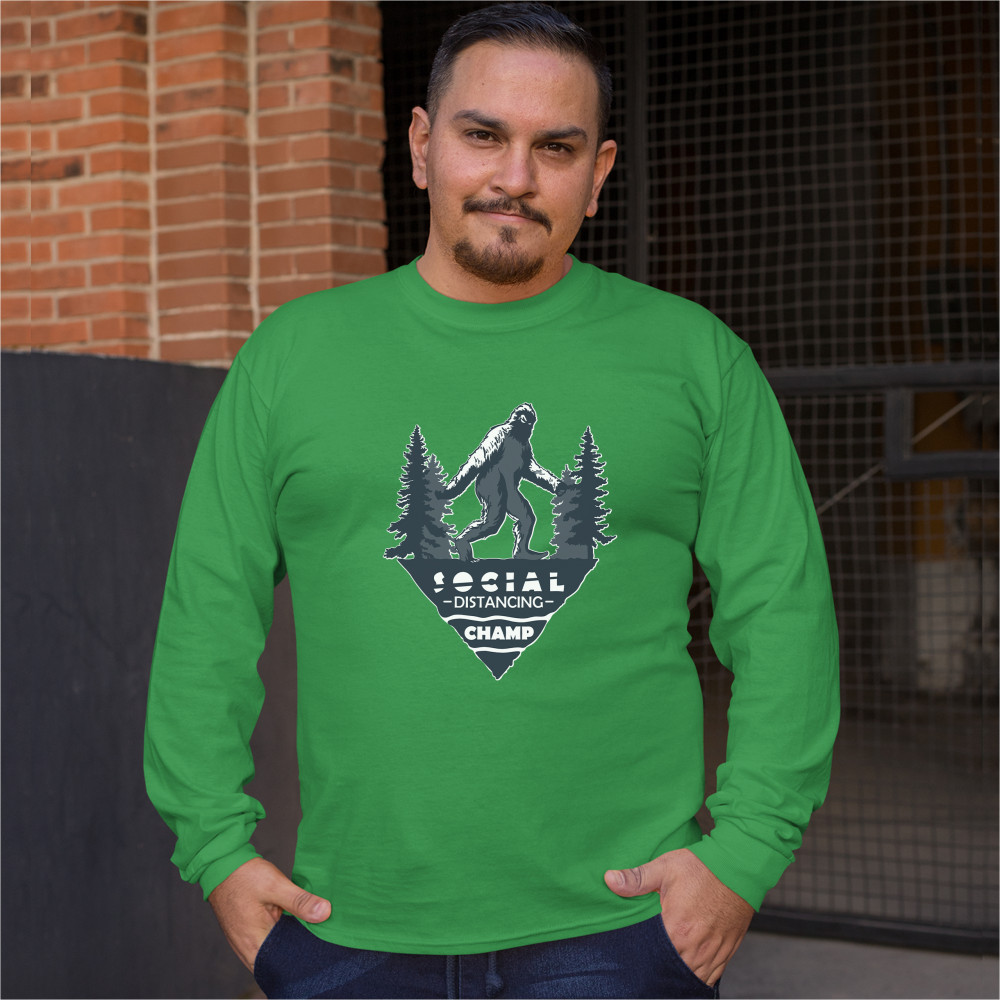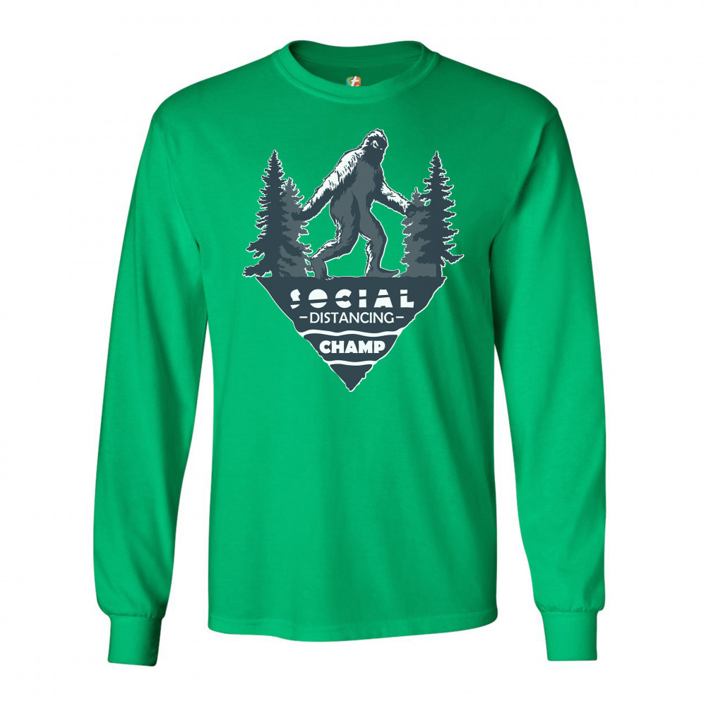 SOCIAL DISTANCING CHAMP long sleeve t-shirt funny bigfoot yeti virus quarantine green