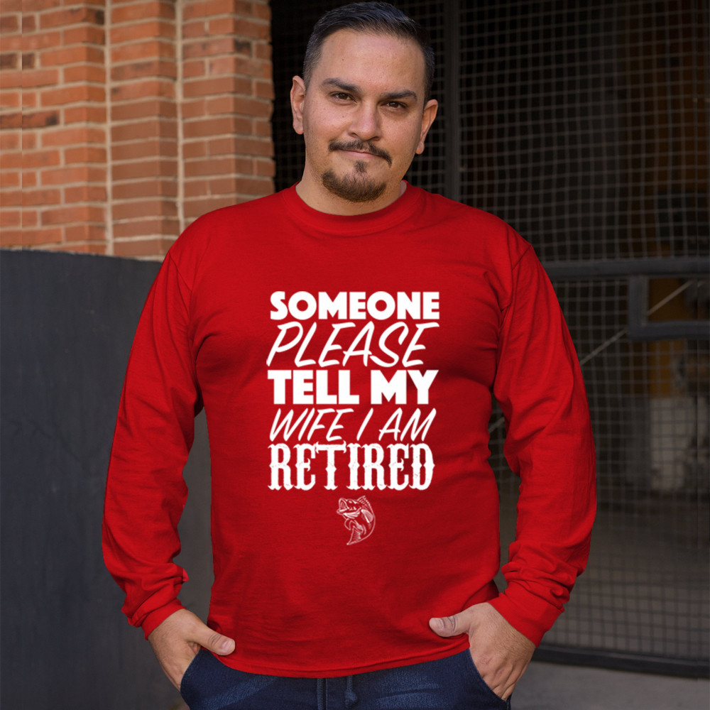 SOMEONE PLEASE TELL MY WIFE I AM RETIRED long sleeve t-shirt father's day red