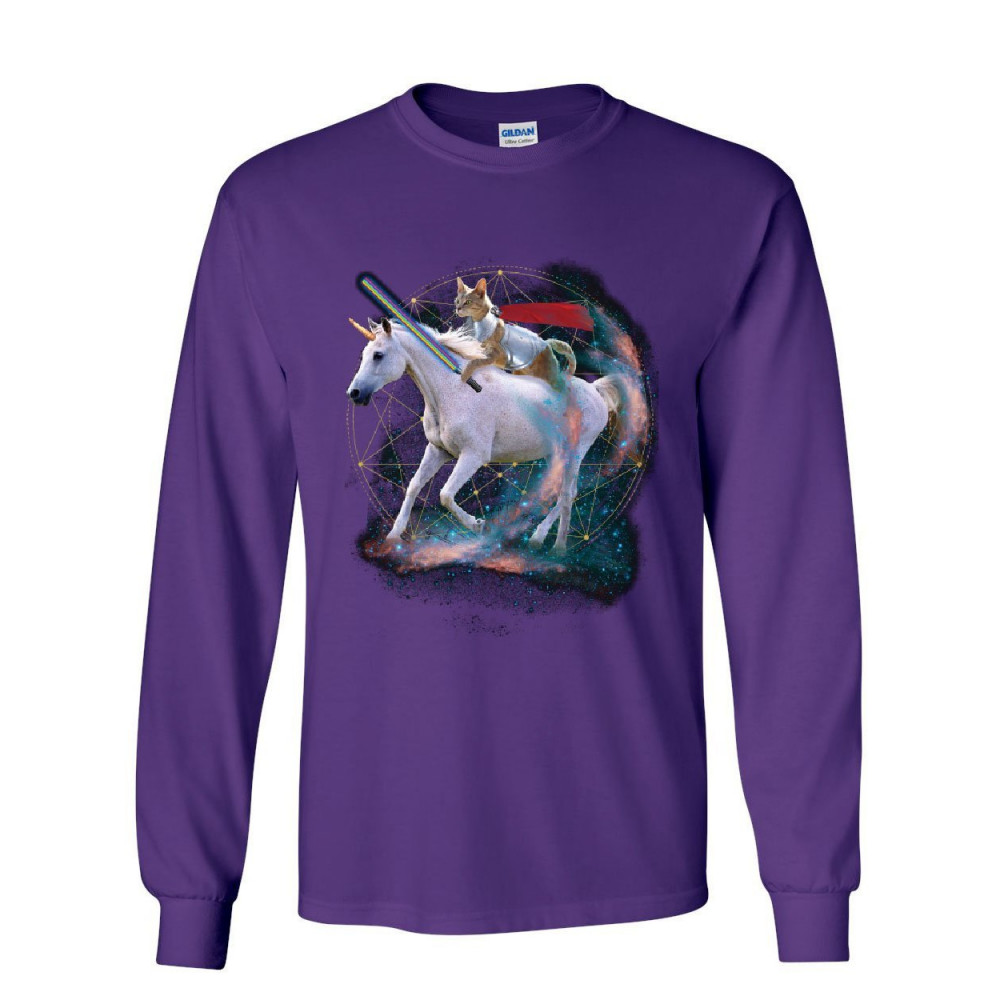 SPACE CAT RIDING A UNICORN with a saber long sleeve t-shirt weird universe tee purple