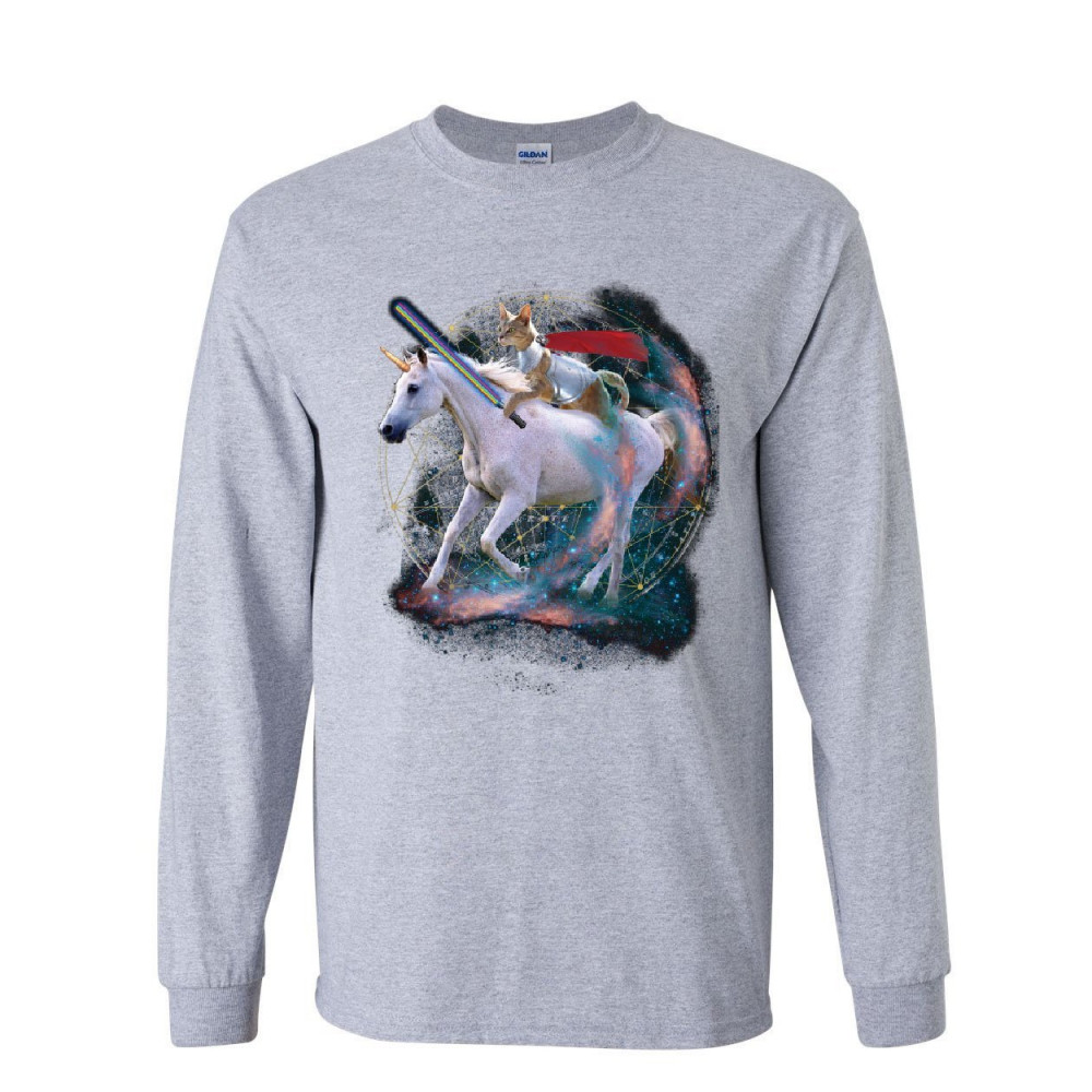 SPACE CAT RIDING A UNICORN with a saber long sleeve t-shirt weird universe tee gray