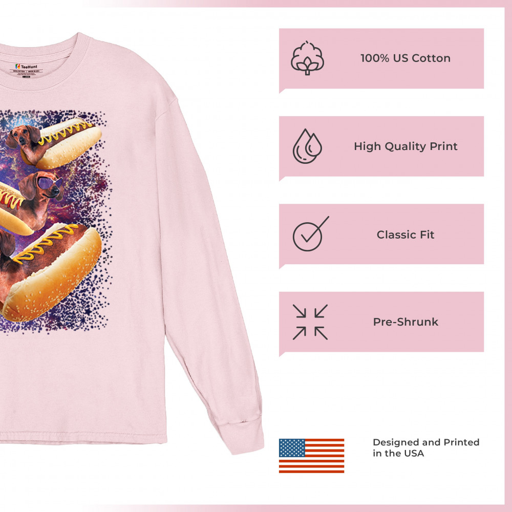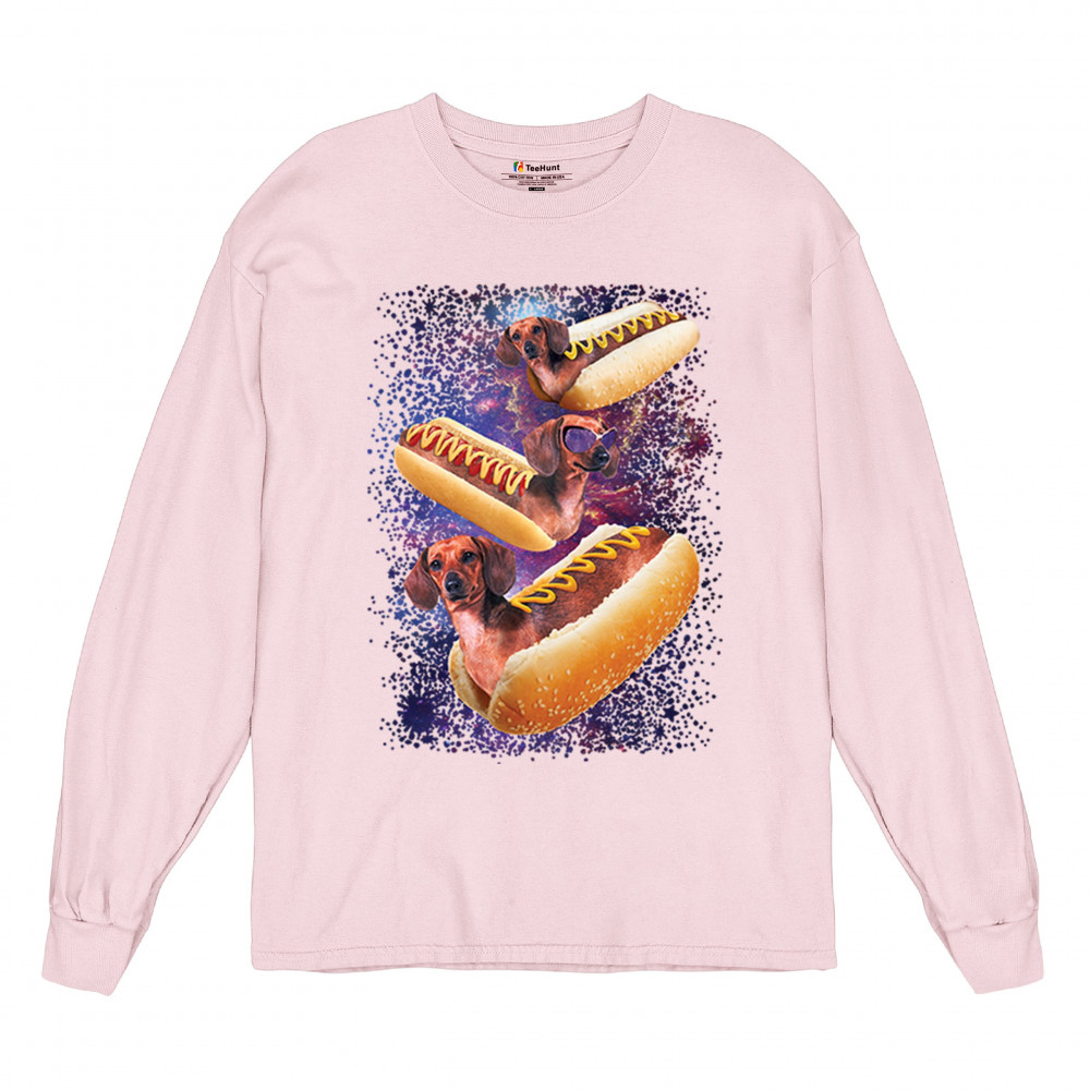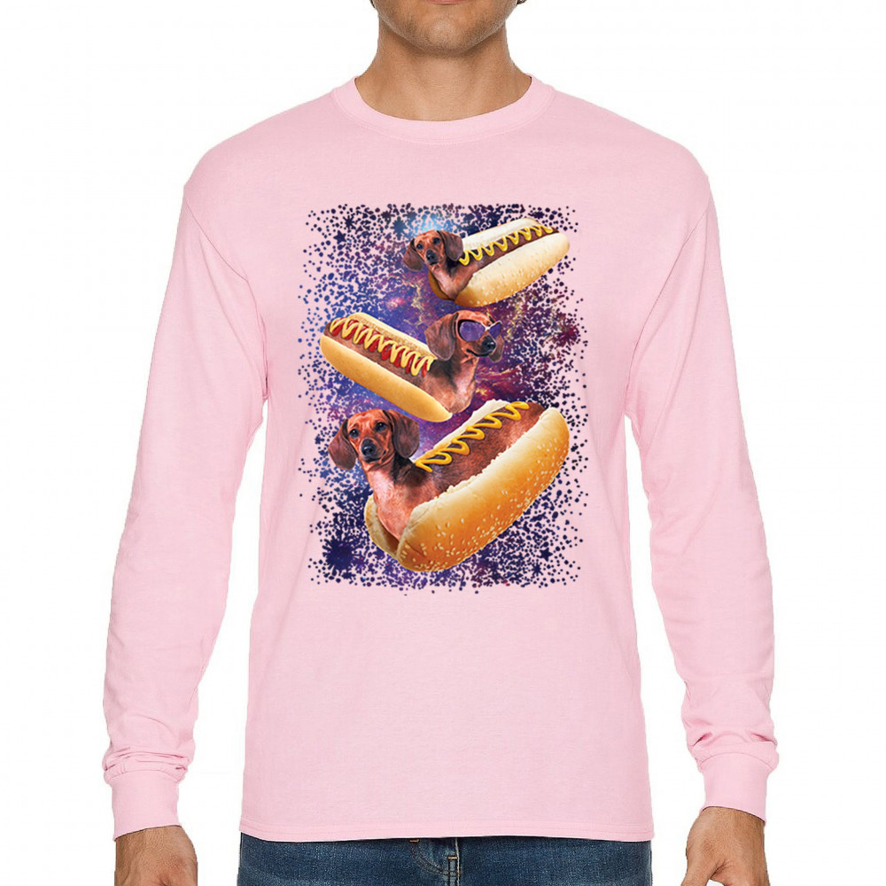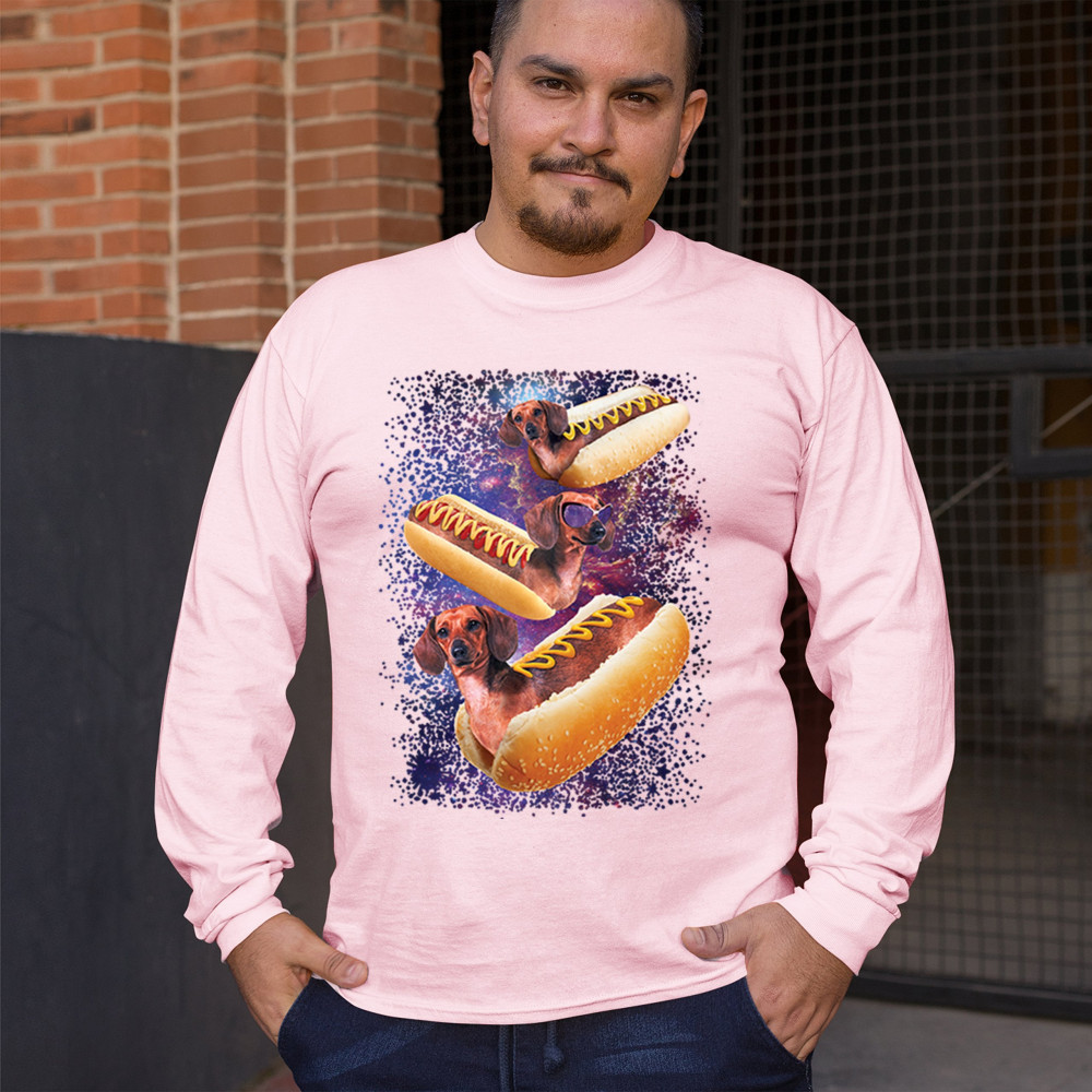 Quirky and fun tee featuring dachshunds as hotdogs in a cosmic setting. Perfect for dog and space lovers. Comfortable and durable.