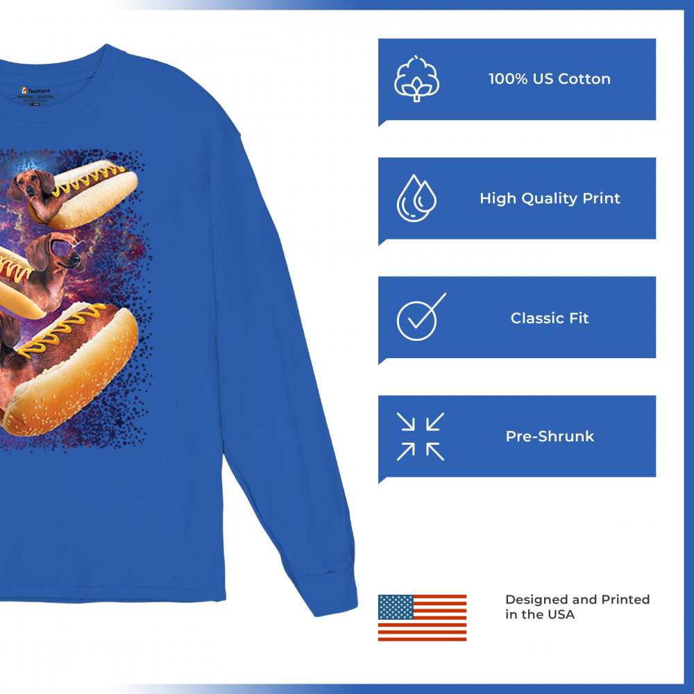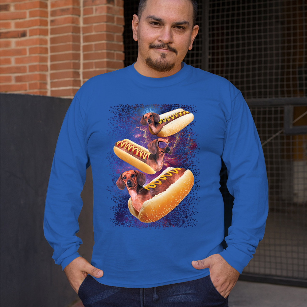 Quirky and fun tee featuring dachshunds as hotdogs in a cosmic setting. Perfect for dog and space lovers. Comfortable and durable.
