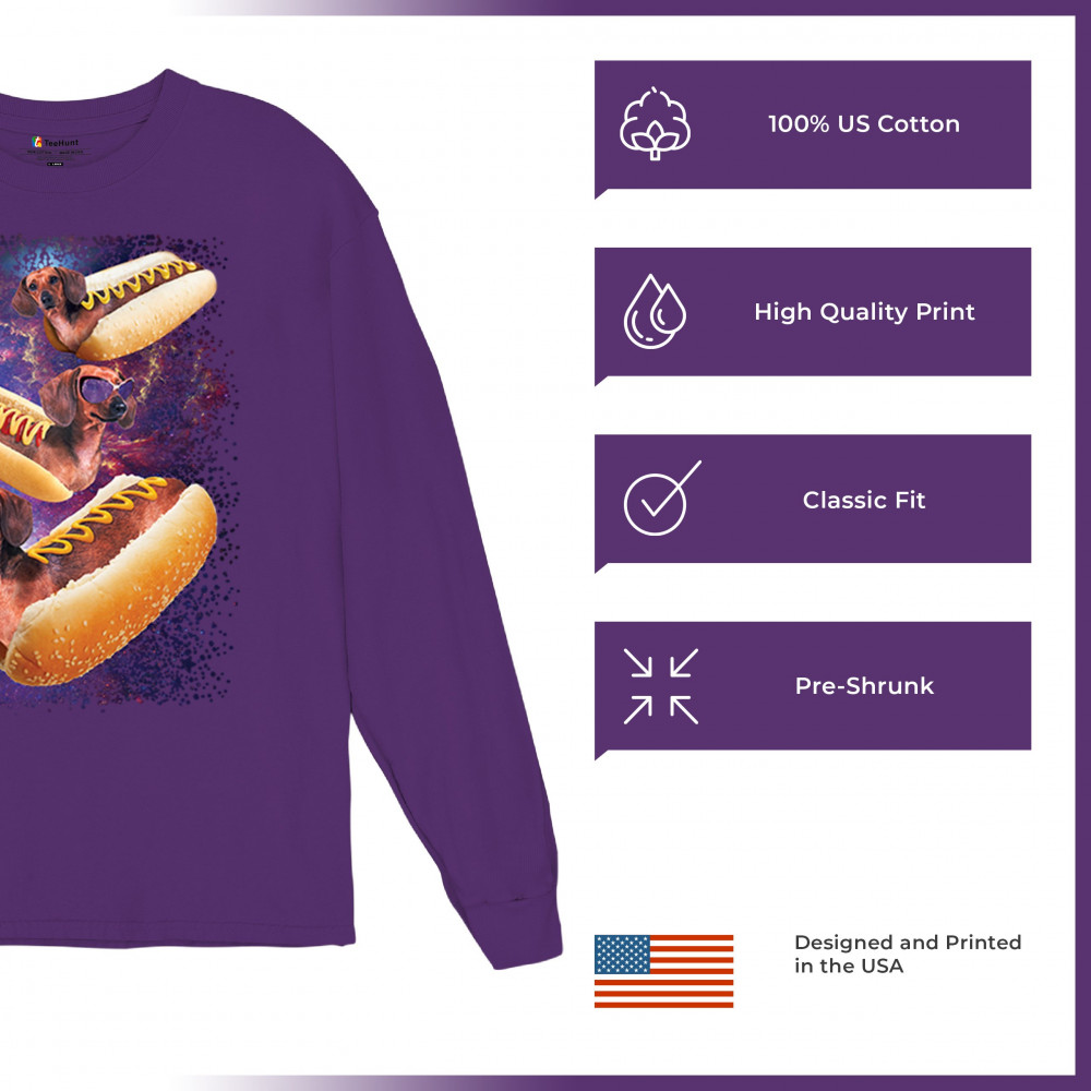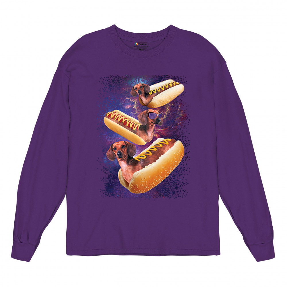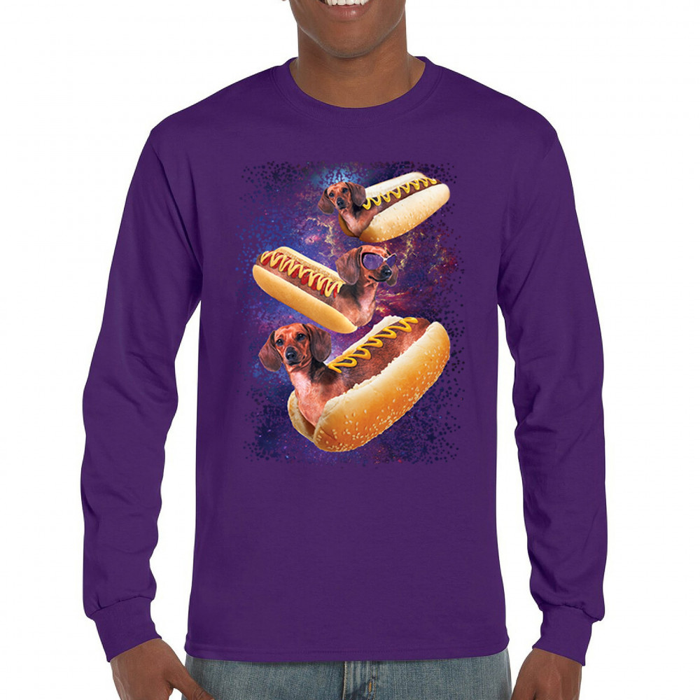 Quirky and fun tee featuring dachshunds as hotdogs in a cosmic setting. Perfect for dog and space lovers. Comfortable and durable.