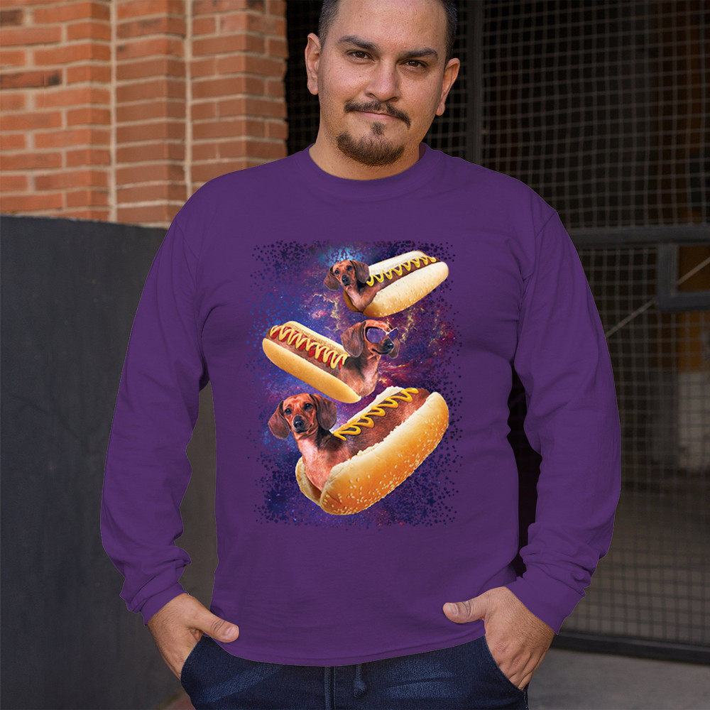 Add a dash of humor to your wardrobe with our unique design featuring adorable dachshunds as hotdogs in a cosmic setting. This playful graphic is perfect for animal lovers and those with a quirky sense of style. The vibrant colors and detailed illustration ensure you stand out in any crowd. Made from premium materials, this tee offers both comfort and durability, making it ideal for everyday wear or special occasions. Embrace your love for dogs and space with this fun and imaginative design.