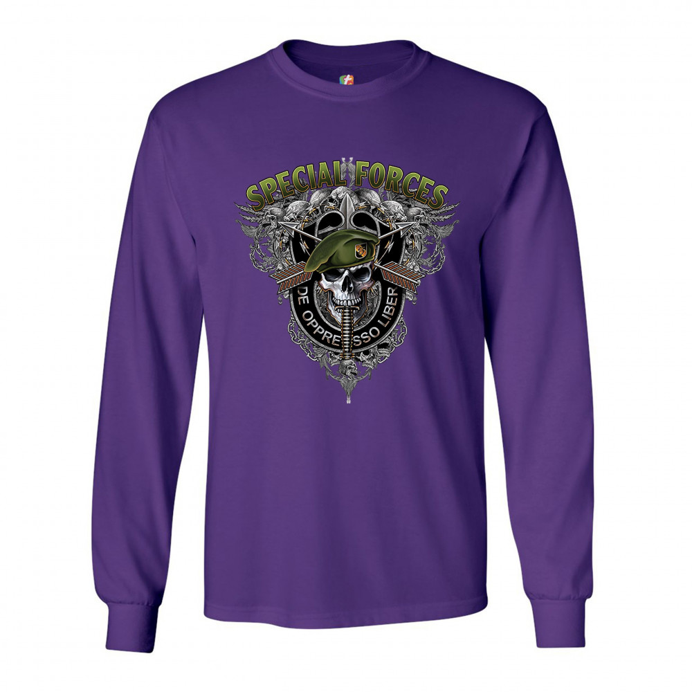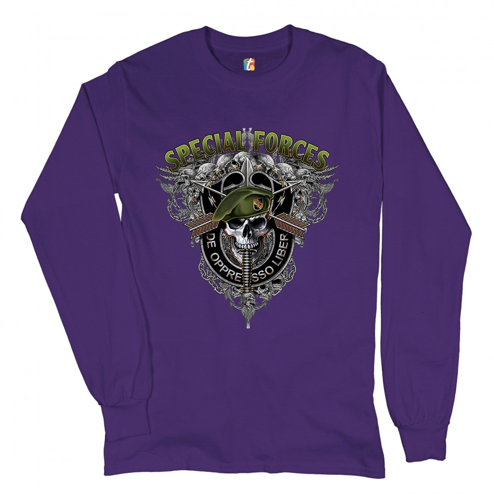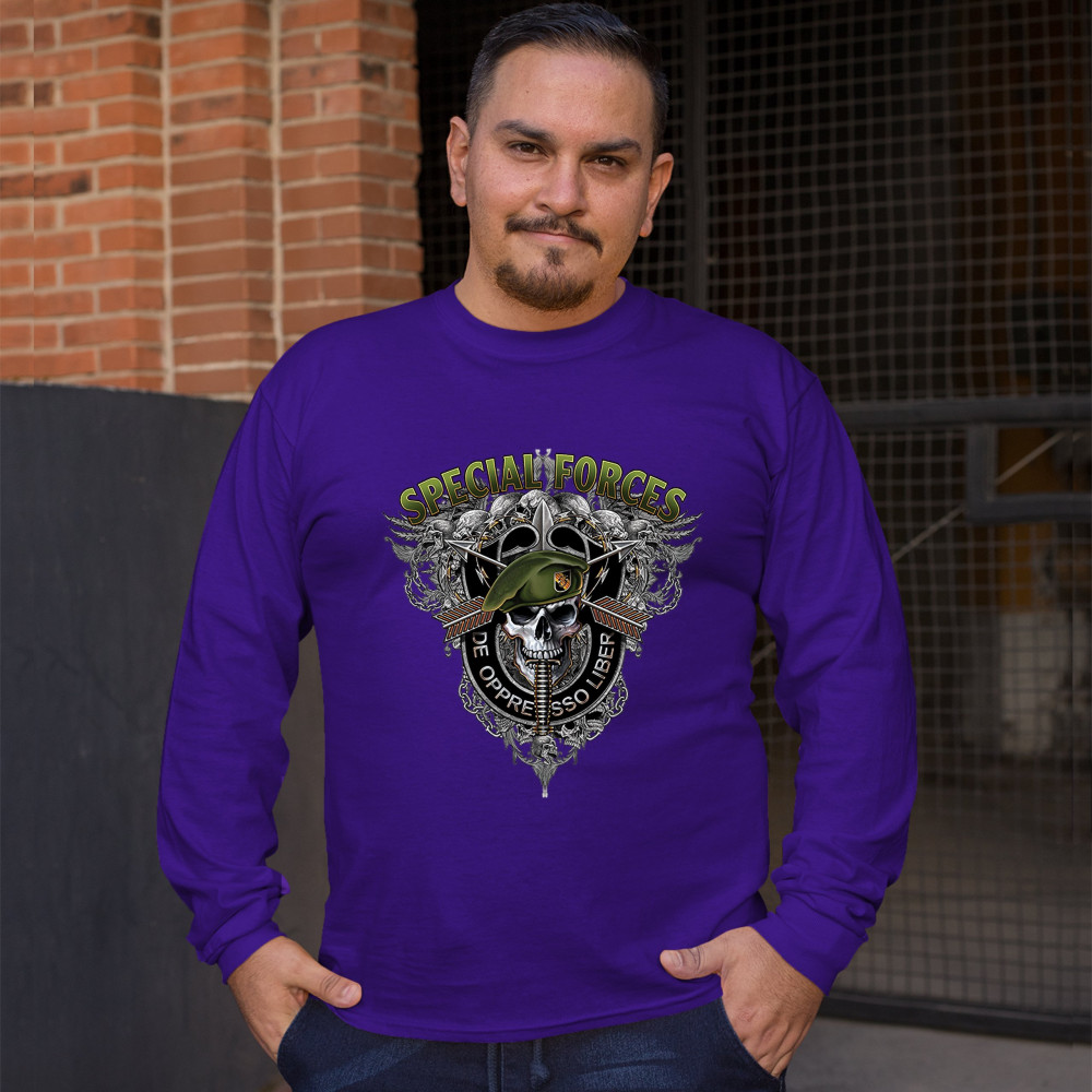 A patriotic print featuring a skull wearing a green beret with a dagger in it's mouth. At the top the print says: "Special Forces". Around the skull there is a black stripe with the special forces' slogan written on it: "de oppresso liber". In the backgro