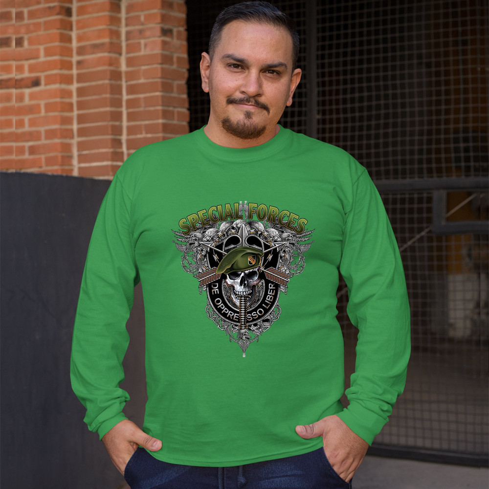 A patriotic print featuring a skull wearing a green beret with a dagger in it's mouth. At the top the print says: "Special Forces". Around the skull there is a black stripe with the special forces' slogan written on it: "de oppresso liber". In the backgro