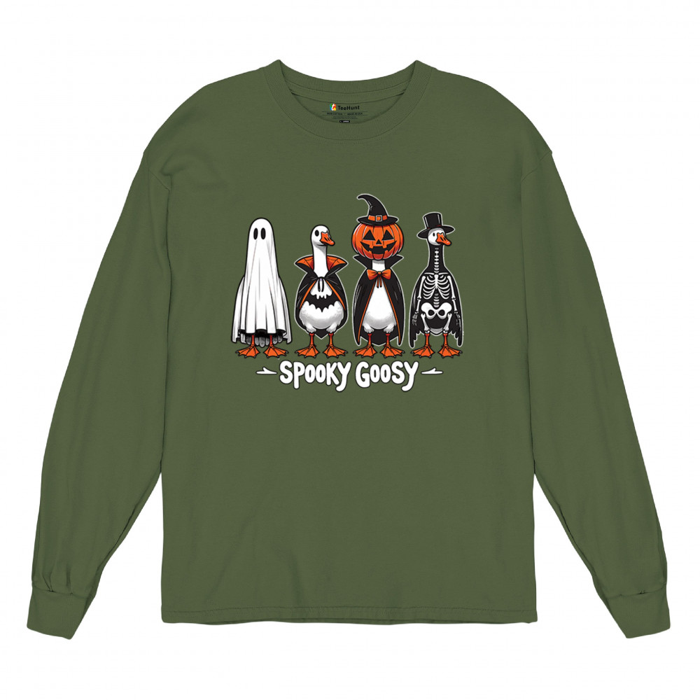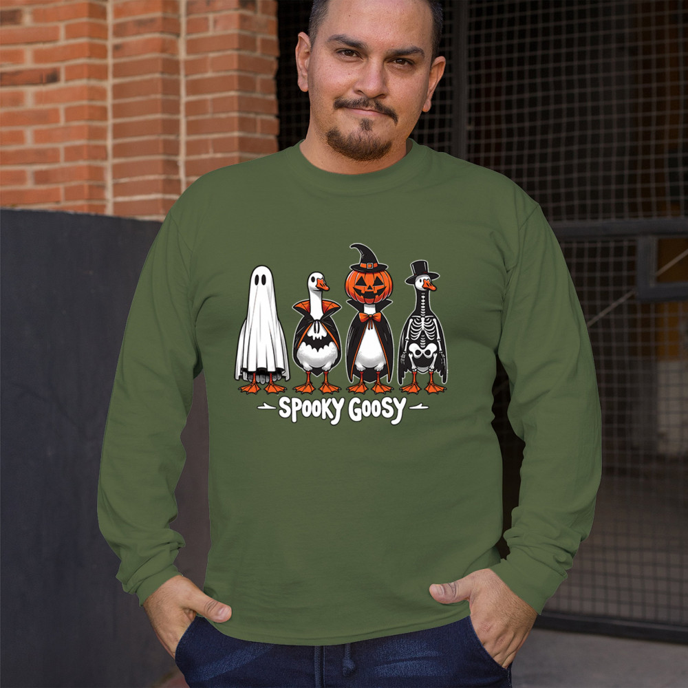 Bring the spooky fun to life with this Spooky Goosy Halloween design featuring geese in witch, skeleton, vampire, and pumpkin costumes. Perfect for haunted house nights, October 31 trick-or-treat events, or monster mash gatherings. A funny and festive choice for goose lovers and Halloween enthusiasts who enjoy creepy costume vibes.