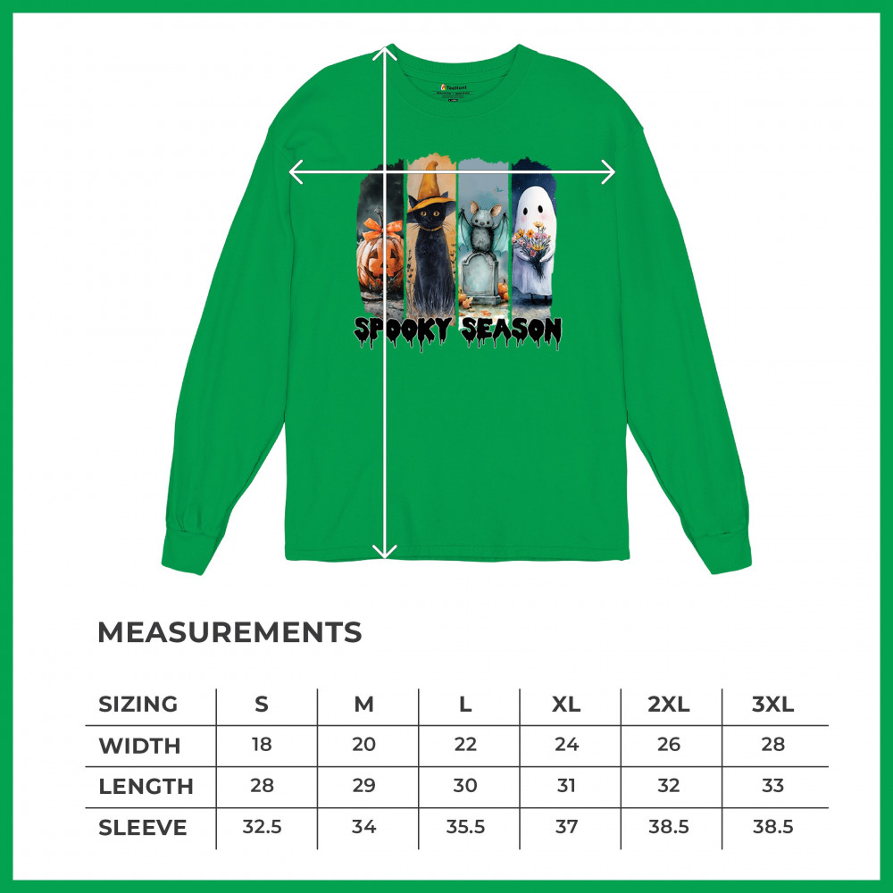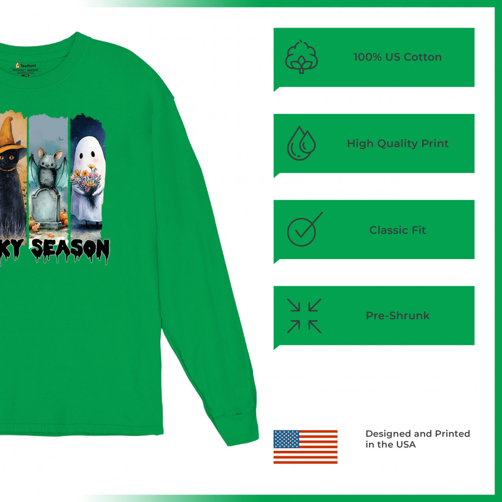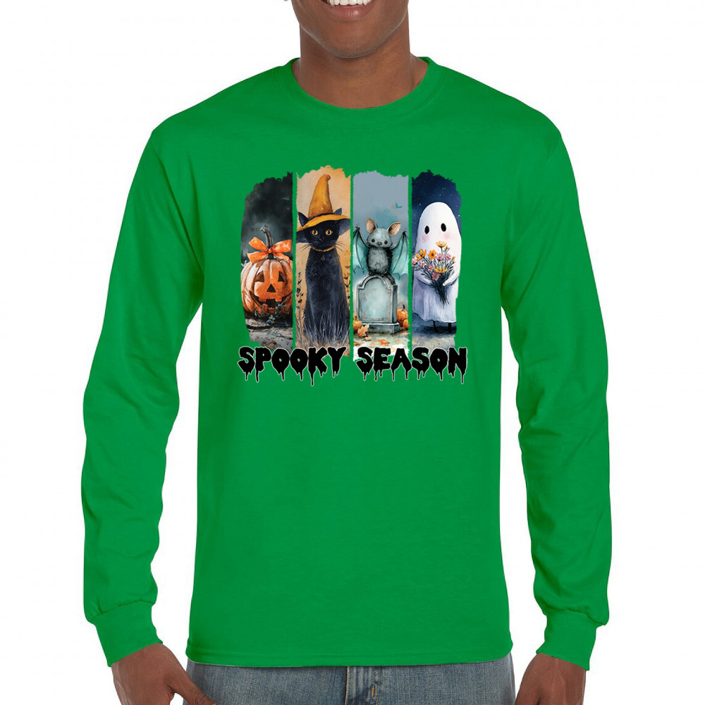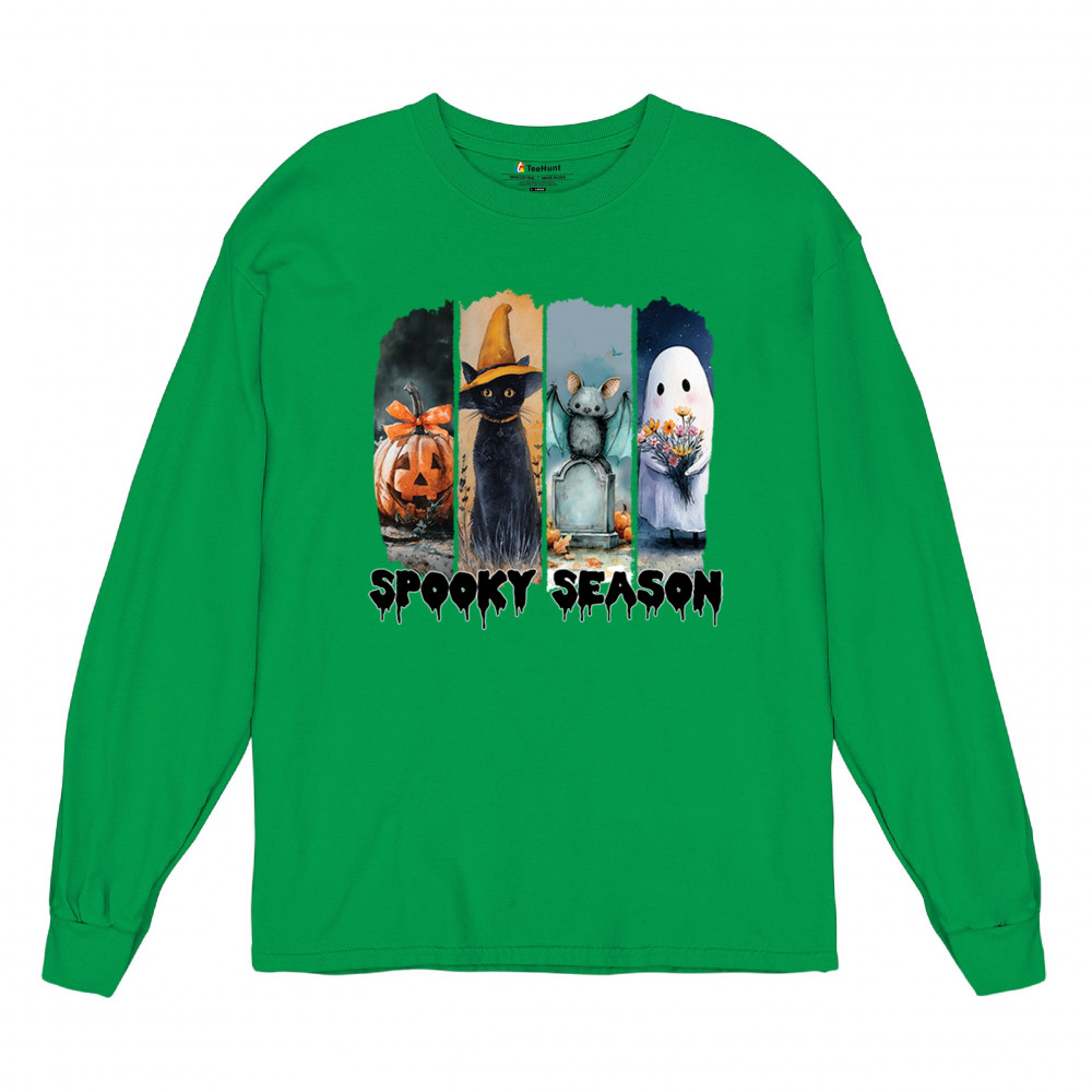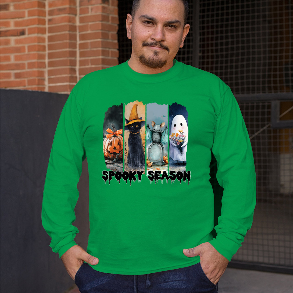 Spooky Season design with scary black cat, jack o lantern, haunted ghost house, and cute ghost. Perfect for October 31, trick or treat, and fall fun.
