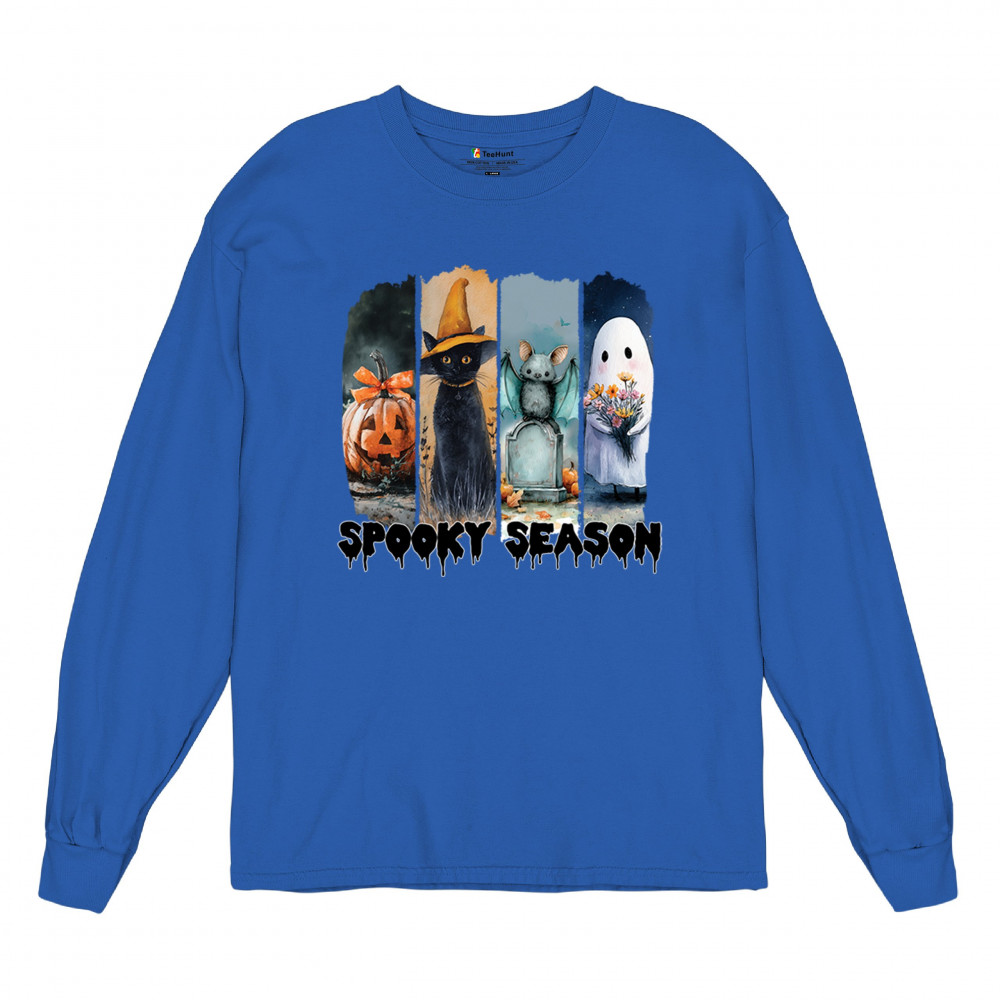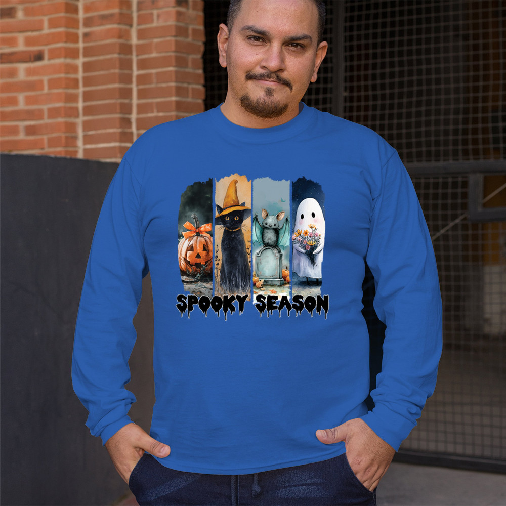 Spooky Season design with scary black cat, jack o lantern, haunted ghost house, and cute ghost. Perfect for October 31, trick or treat, and fall fun.
