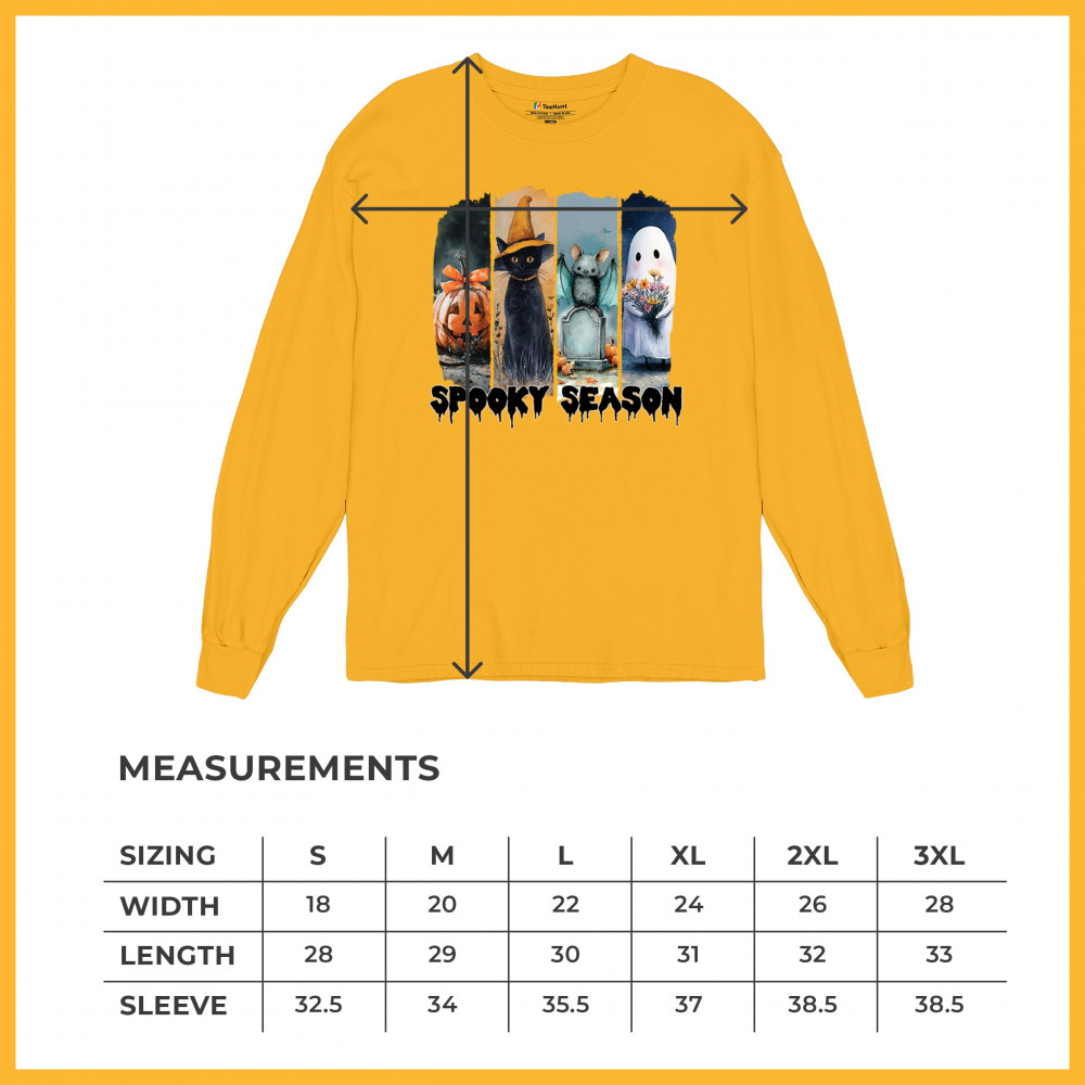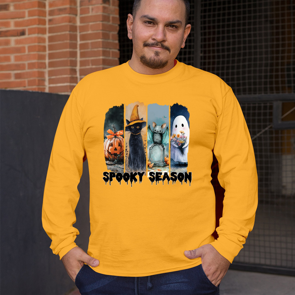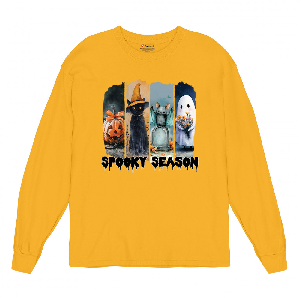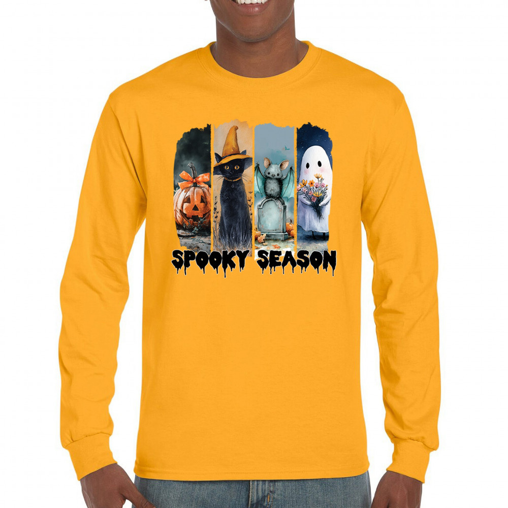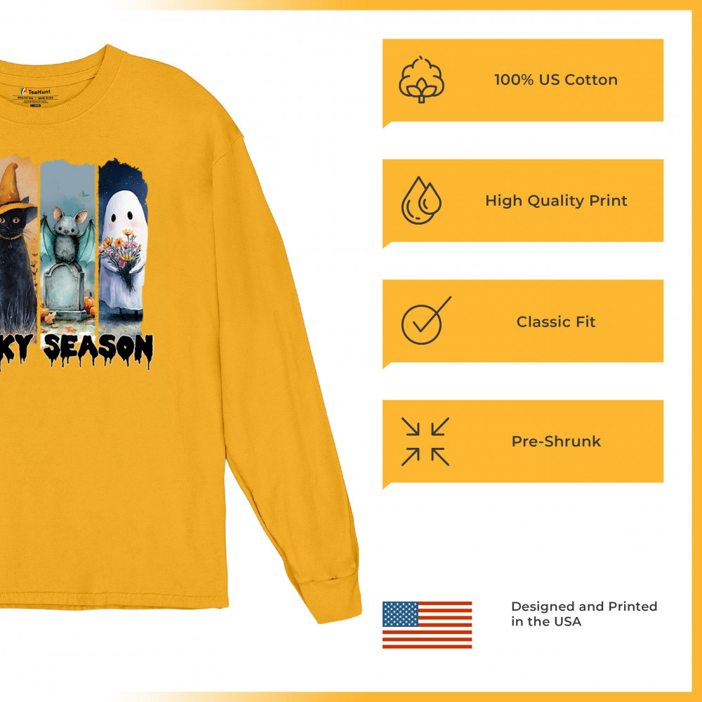 Spooky Season design with scary black cat, jack o lantern, haunted ghost house, and cute ghost. Perfect for October 31, trick or treat, and fall fun.