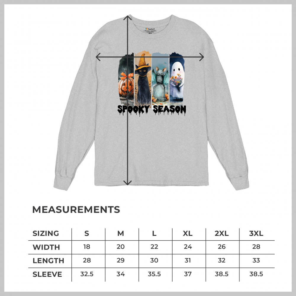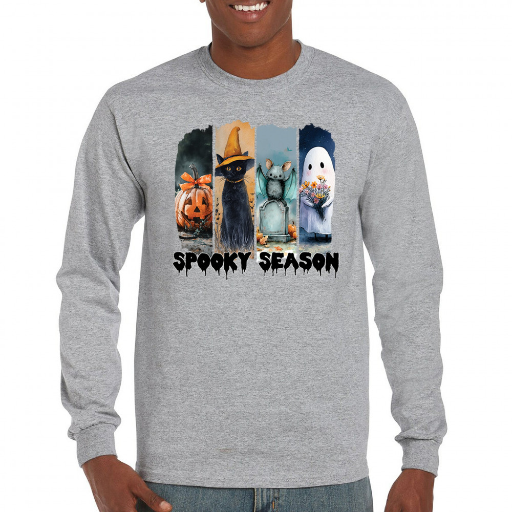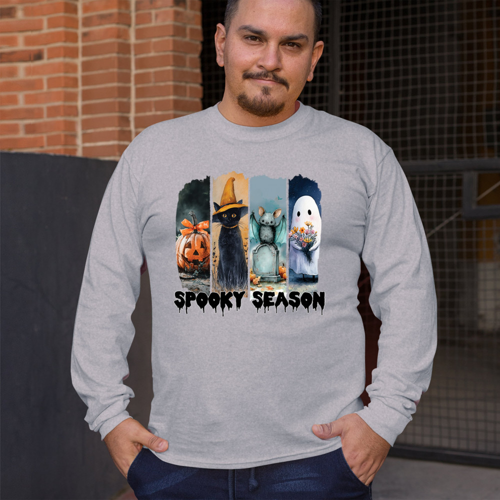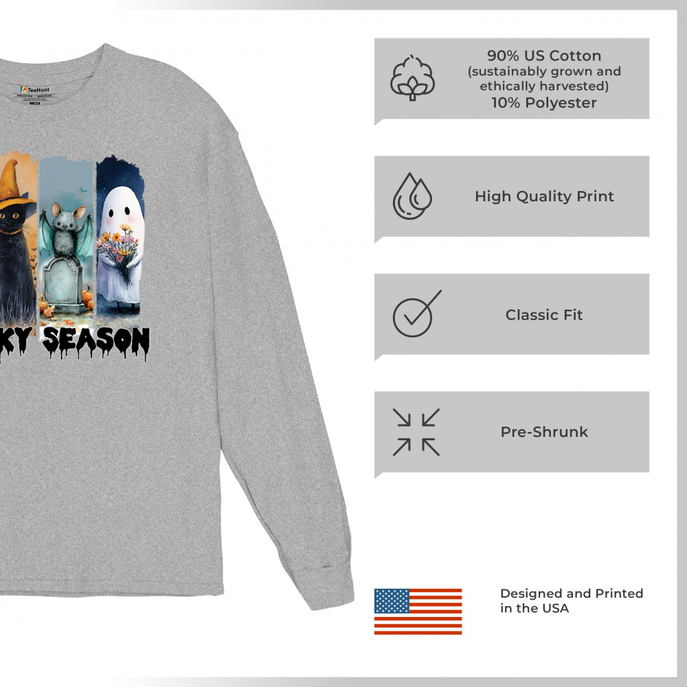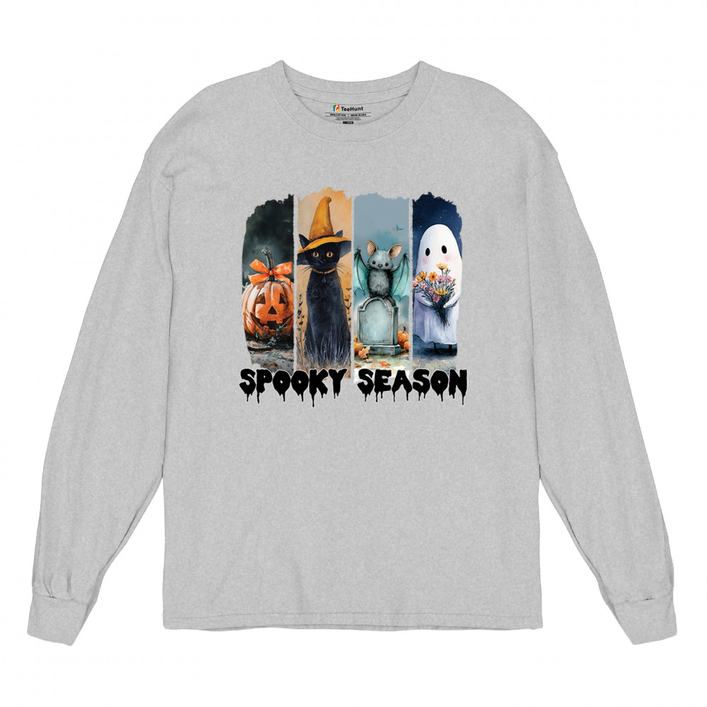 Spooky Season design with scary black cat, jack o lantern, haunted ghost house, and cute ghost. Perfect for October 31, trick or treat, and fall fun.