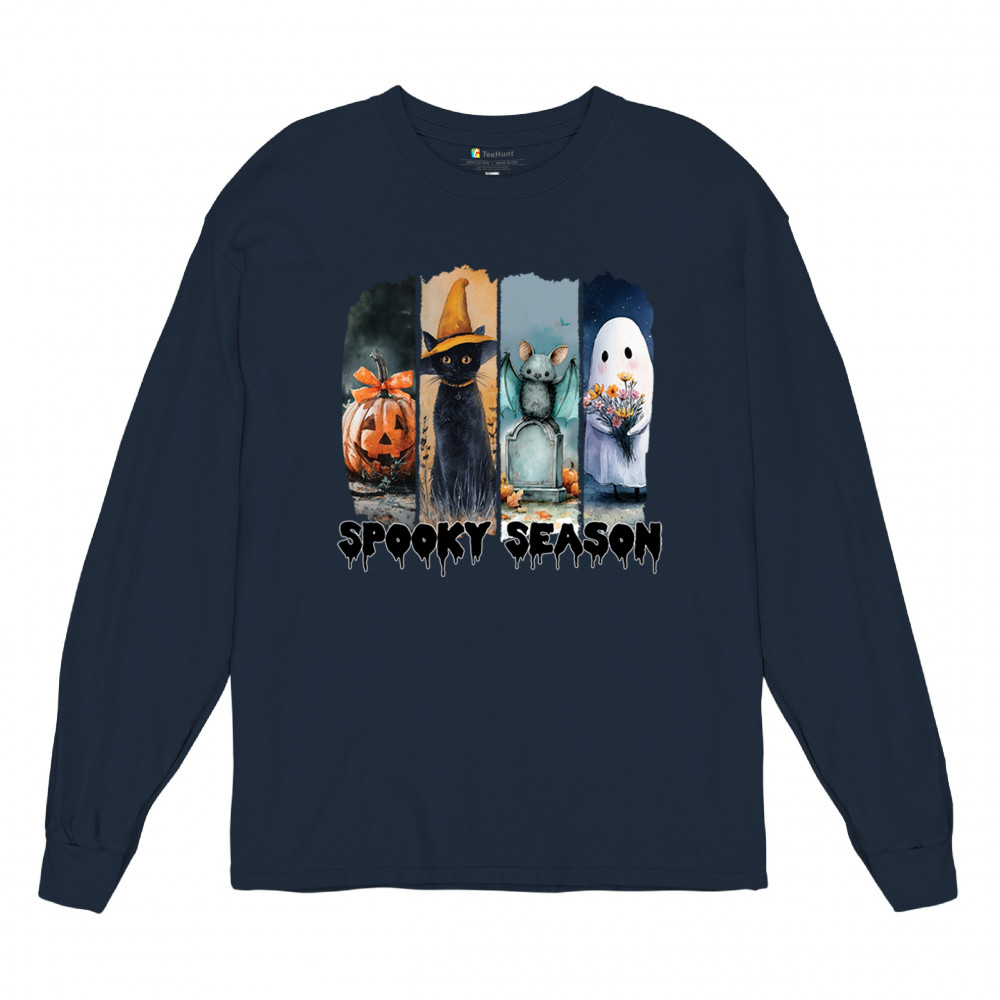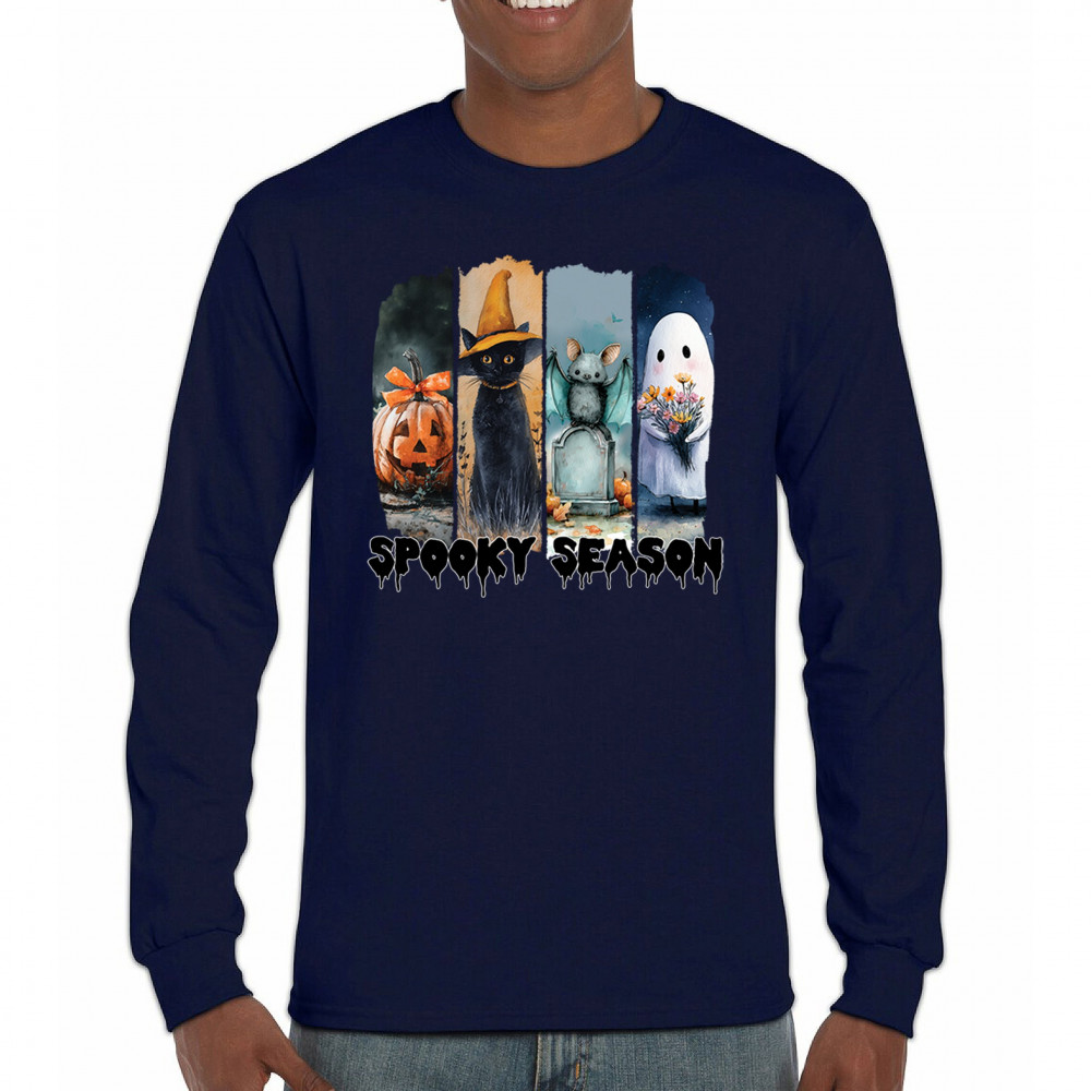 Spooky Season design with scary black cat, jack o lantern, haunted ghost house, and cute ghost. Perfect for October 31, trick or treat, and fall fun.
