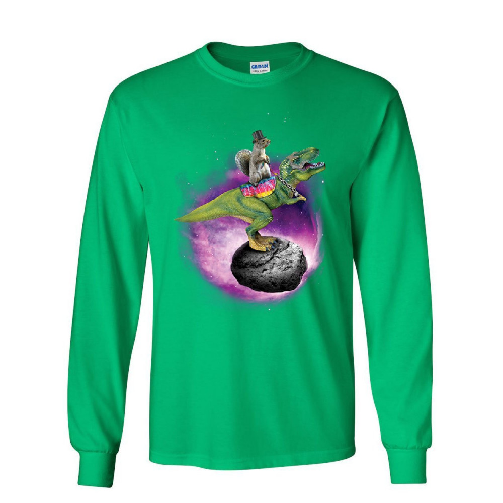SQUIRREL RIDING T-REX RIDING ASTEROID long sleeve t-shirt funny space weird tee green