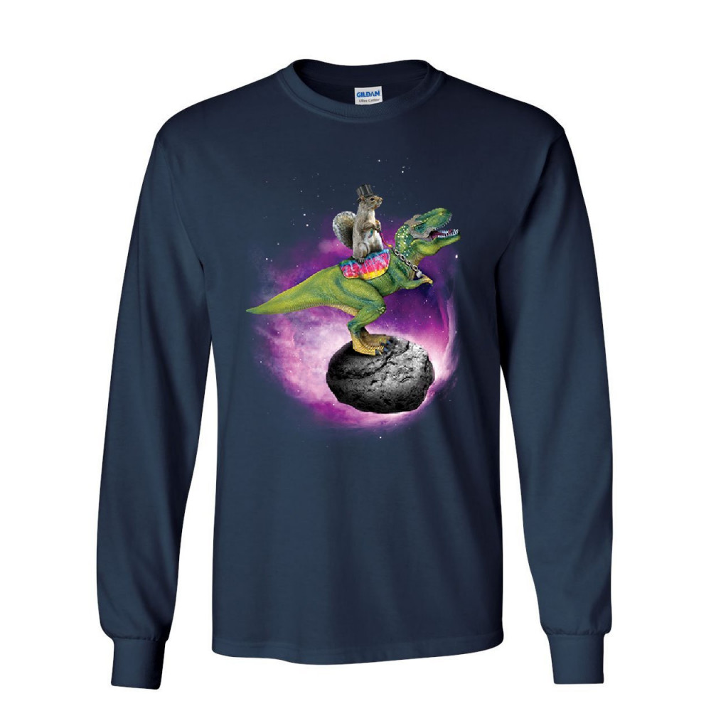 SQUIRREL RIDING T-REX RIDING ASTEROID long sleeve t-shirt funny space weird tee navy blue