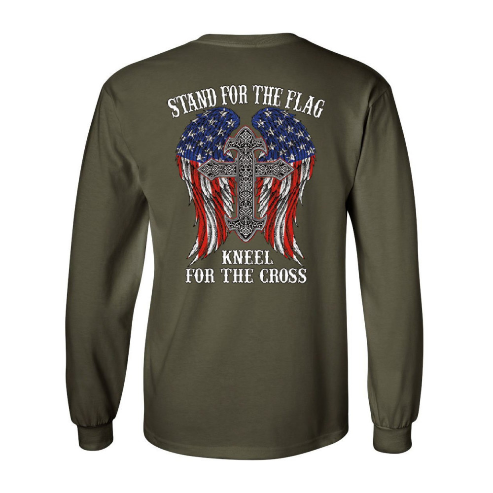 STAND FOR THE FLAG KNEEL FOR THE CROSS long sleeve t-shirt patriot political tee military green