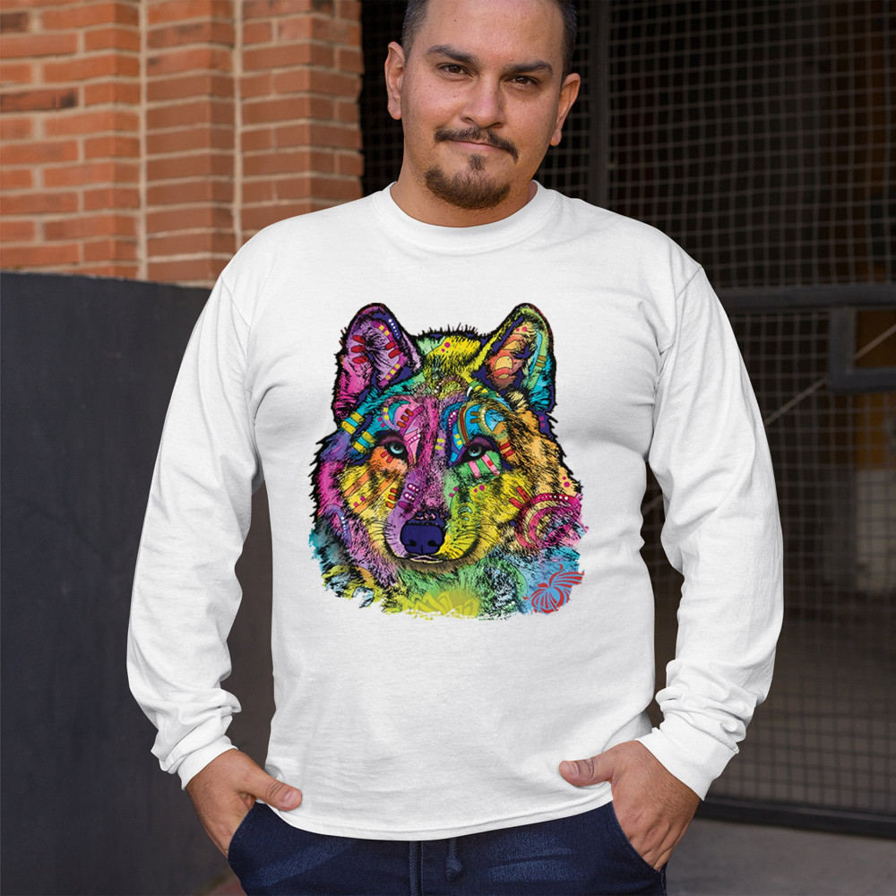 STARE OF THE WOLF long sleeve t-shirt dean russo colorful neon animal art white