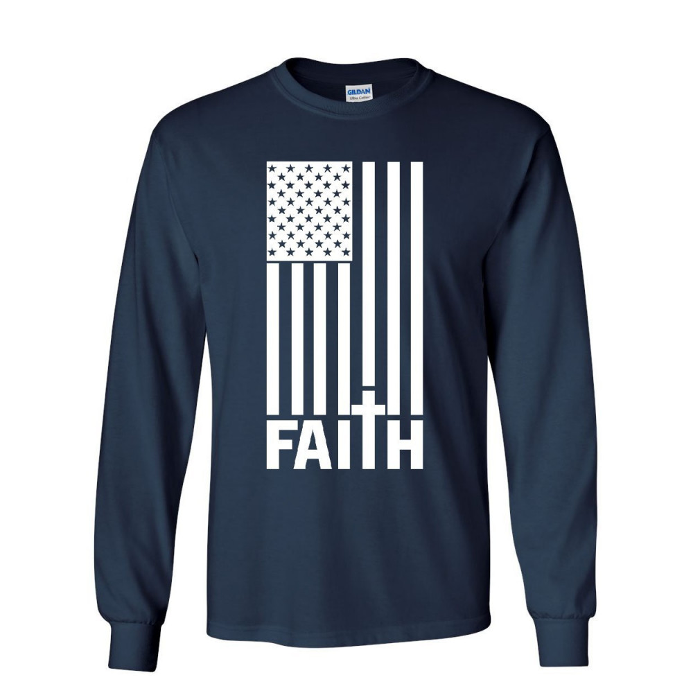 STARS AND STRIPES FAITH long sleeve t-shirt american values cross jesus god tee navy blue