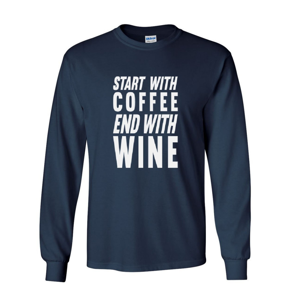 START WITH COFFEE END WITH WINE long sleeve t-shirt drinking daily routine tee navy blue