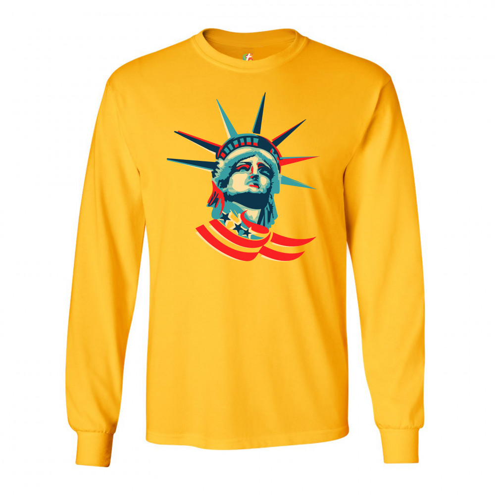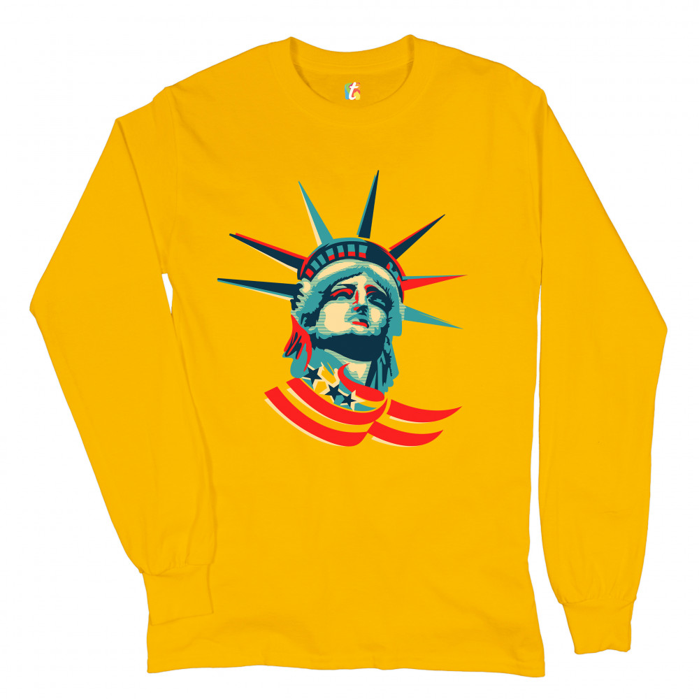 A patriotic print featuring a dripping silhouette of a bald eagle. The body is painted blue with lots of stars on it and the feathers of the wings, painted red, resemble the stripes of the American Flag. Over the wings there is a text written: "Land of the free home of the brave". Great choice to wear on Independence Day or any other patriotic holiday.