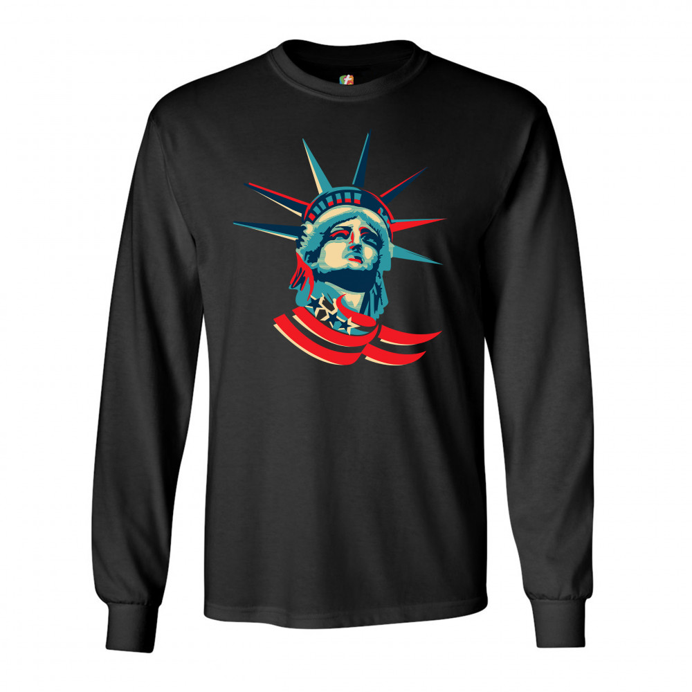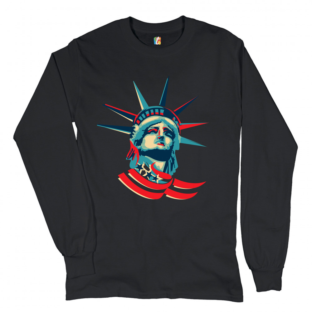 A patriotic print featuring a dripping silhouette of a bald eagle. The body is painted blue with lots of stars on it and the feathers of the wings, painted red, resemble the stripes of the American Flag. Over the wings there is a text written: "Land of the free home of the brave". Great choice to wear on Independence Day or any other patriotic holiday.