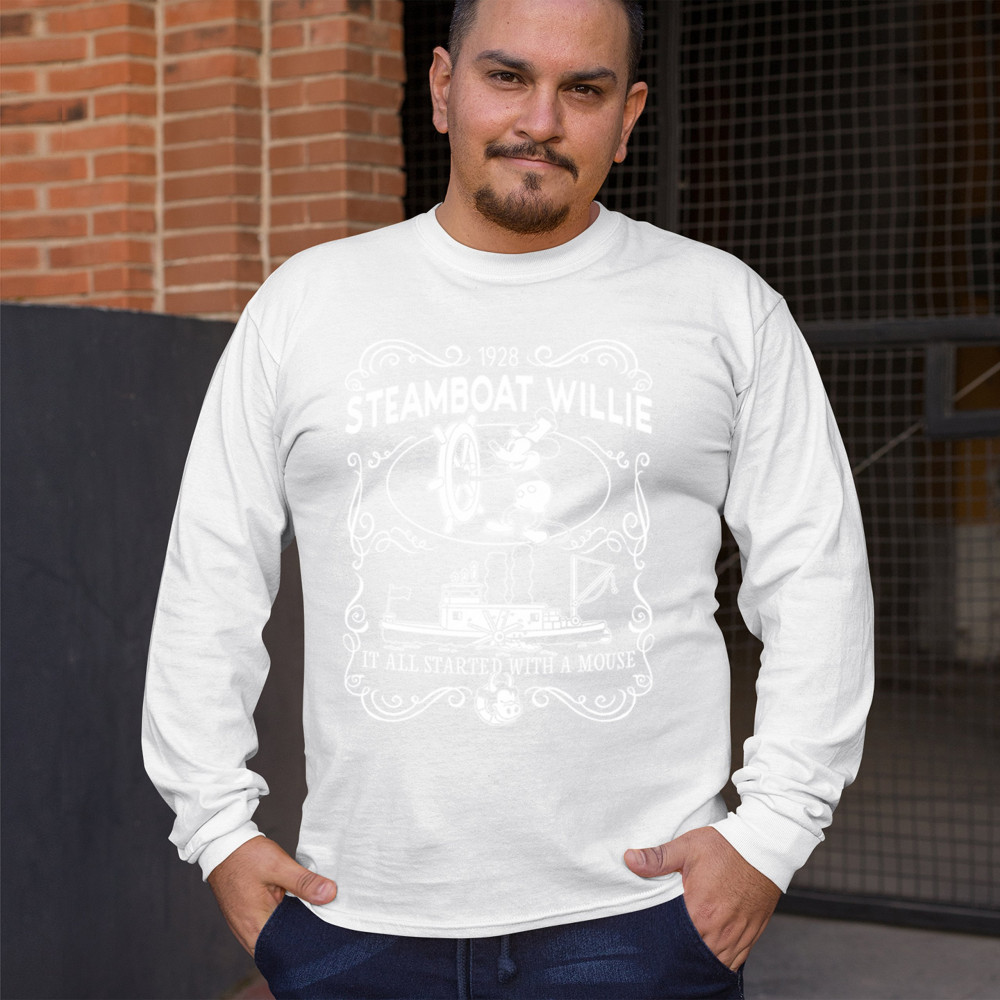 Set sail through the annals of animation as Steamboat Willie commands the vessel, echoing the timeless refrain, 'It all began with a mouse.