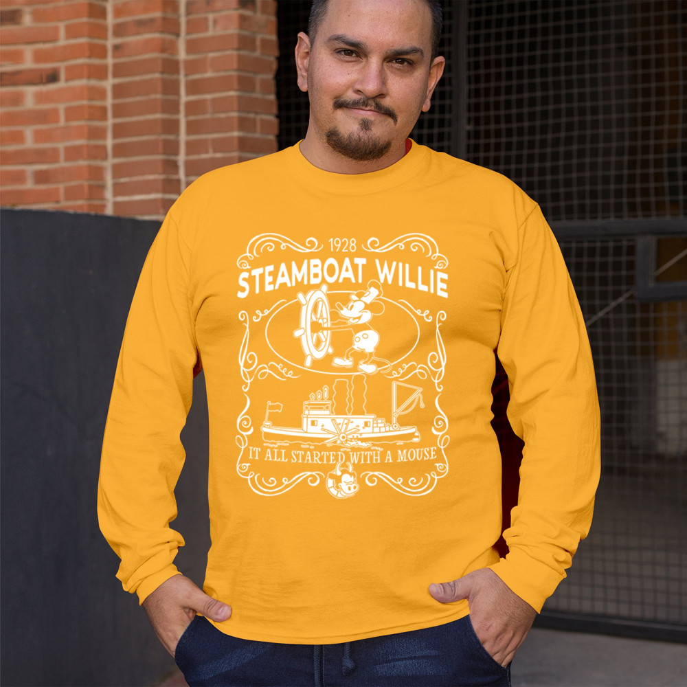Set sail through the annals of animation as Steamboat Willie commands the vessel, echoing the timeless refrain, 'It all began with a mouse.