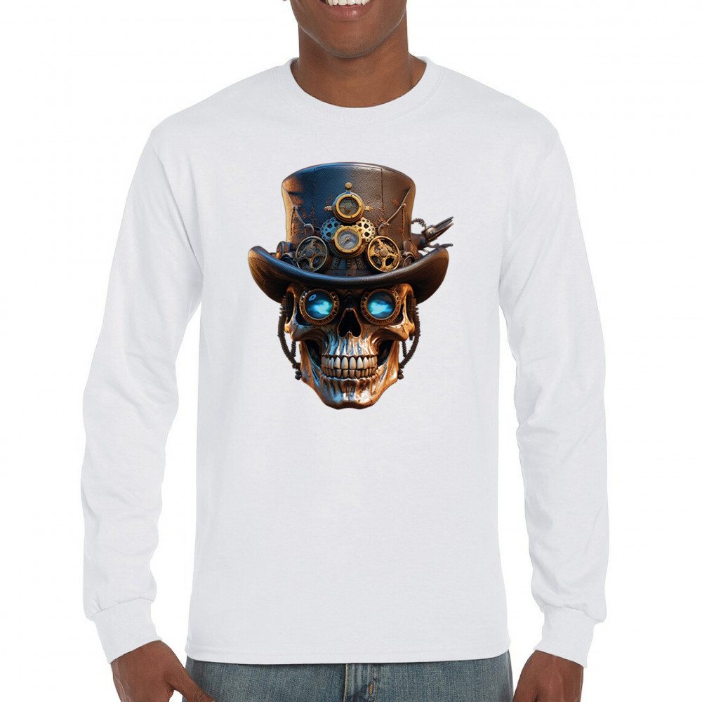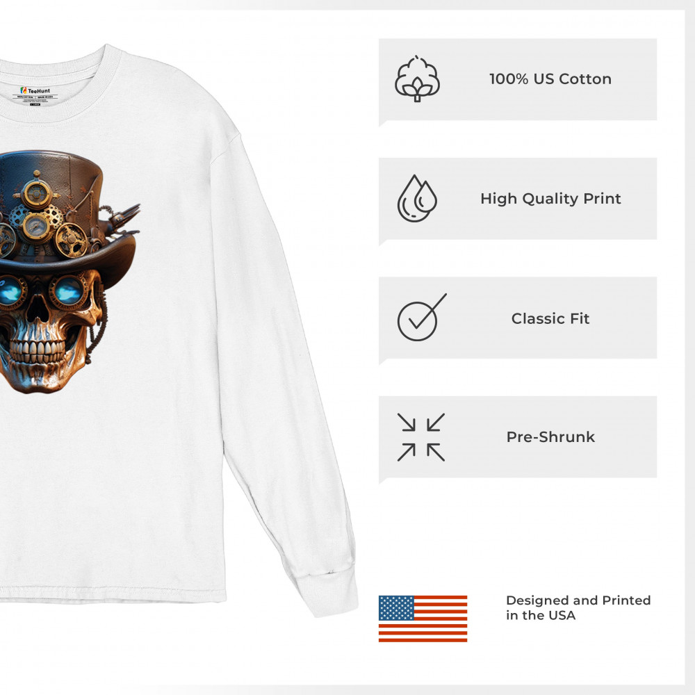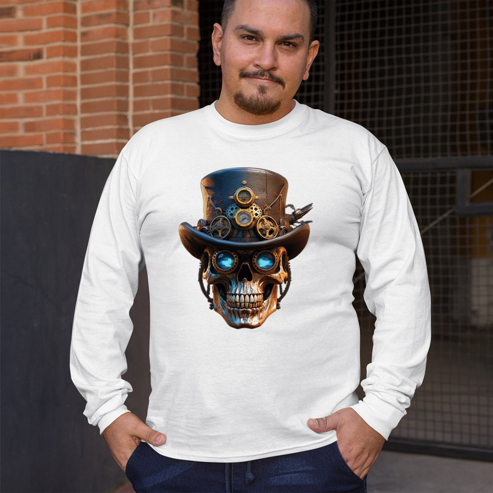 Steampunk skull shirt with gothic retro-futurism. Perfect for Halloween, cosplay, biker rallies, and edgy rebel fashion lovers.