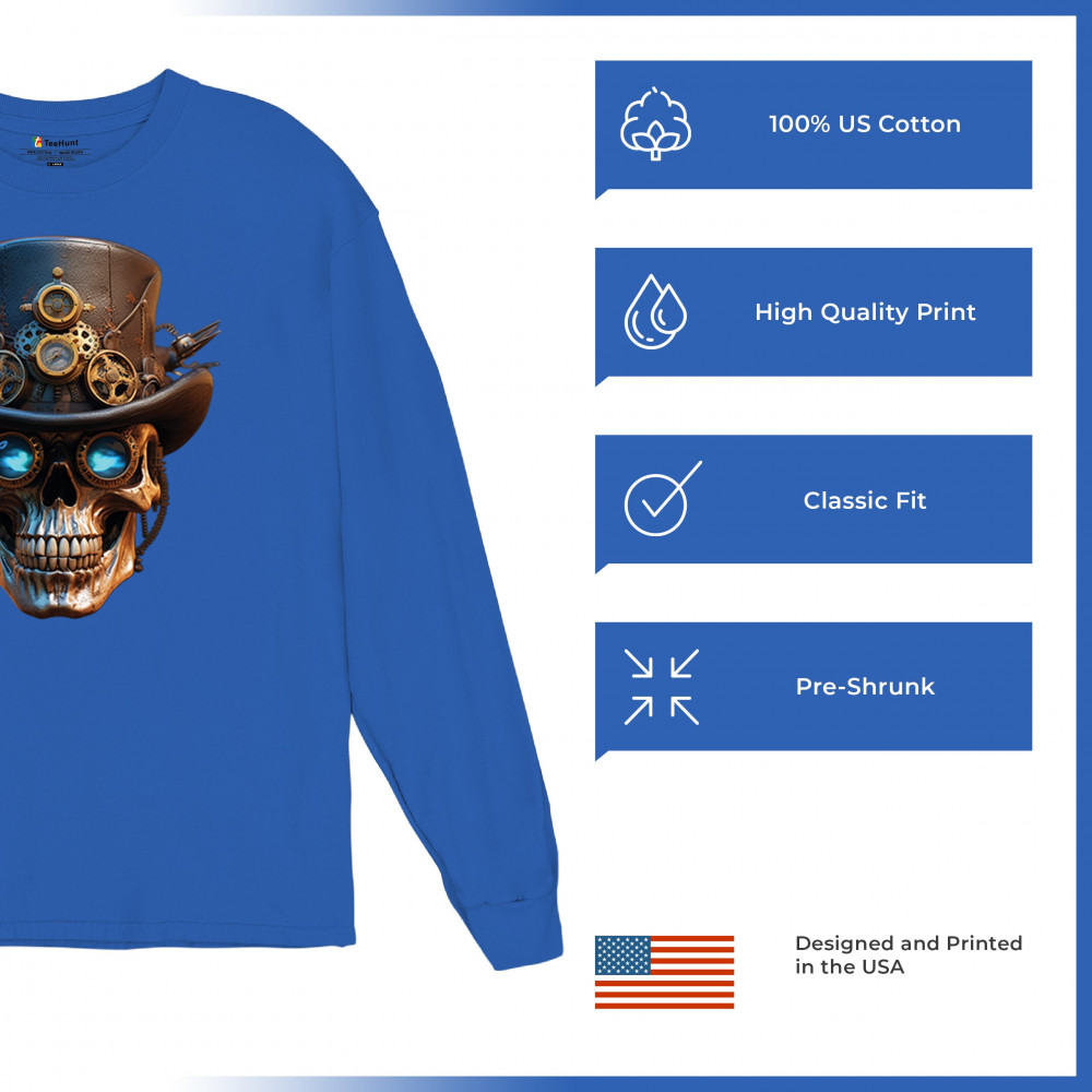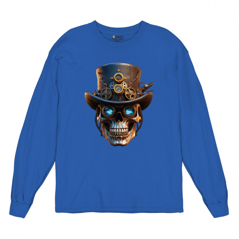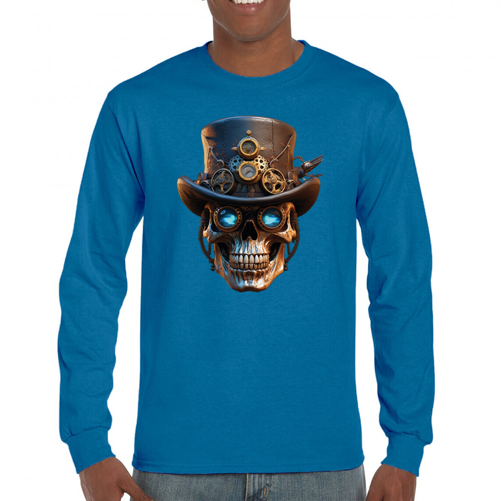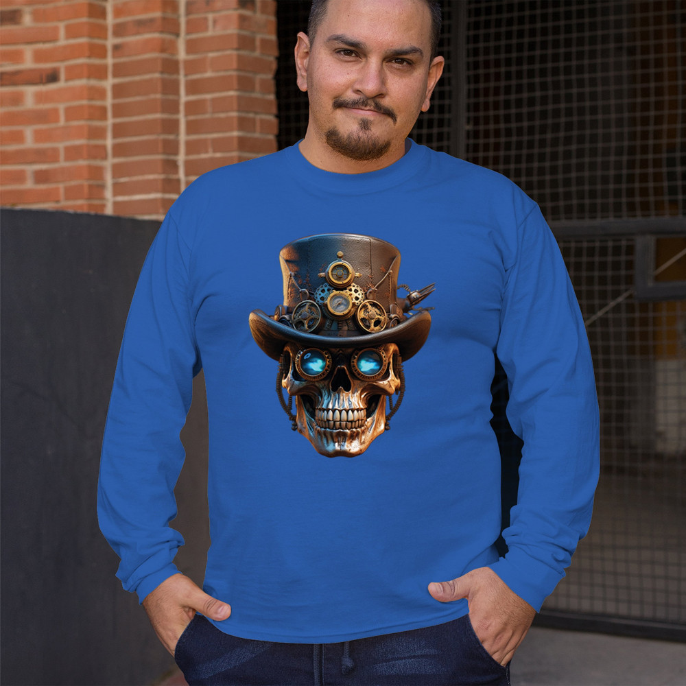 Steampunk skull shirt with gothic retro-futurism. Perfect for Halloween, cosplay, biker rallies, and edgy rebel fashion lovers.